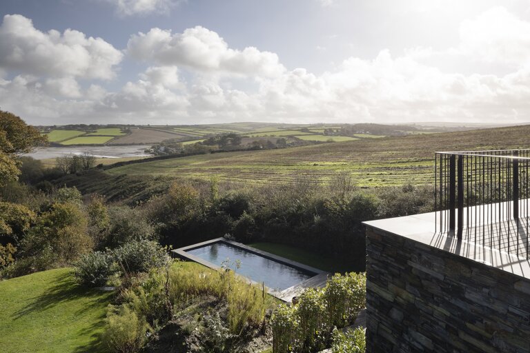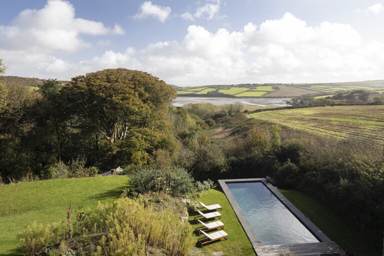 Features: Coastal / Three acres of private land / Estuary / Moorland views / Landscaped gardens / Mature woodland with a stream / Private access to the water / Swimming pool / Open-plan kitchen, dining, and living areas / Floor-to-ceiling glazing / TV room with drop-down cinema screen / Self-contained annex / Contemporary materials and architectural detailing / Skate shack with a half pipe / Woodland tent positioned on a raised platform above a stream