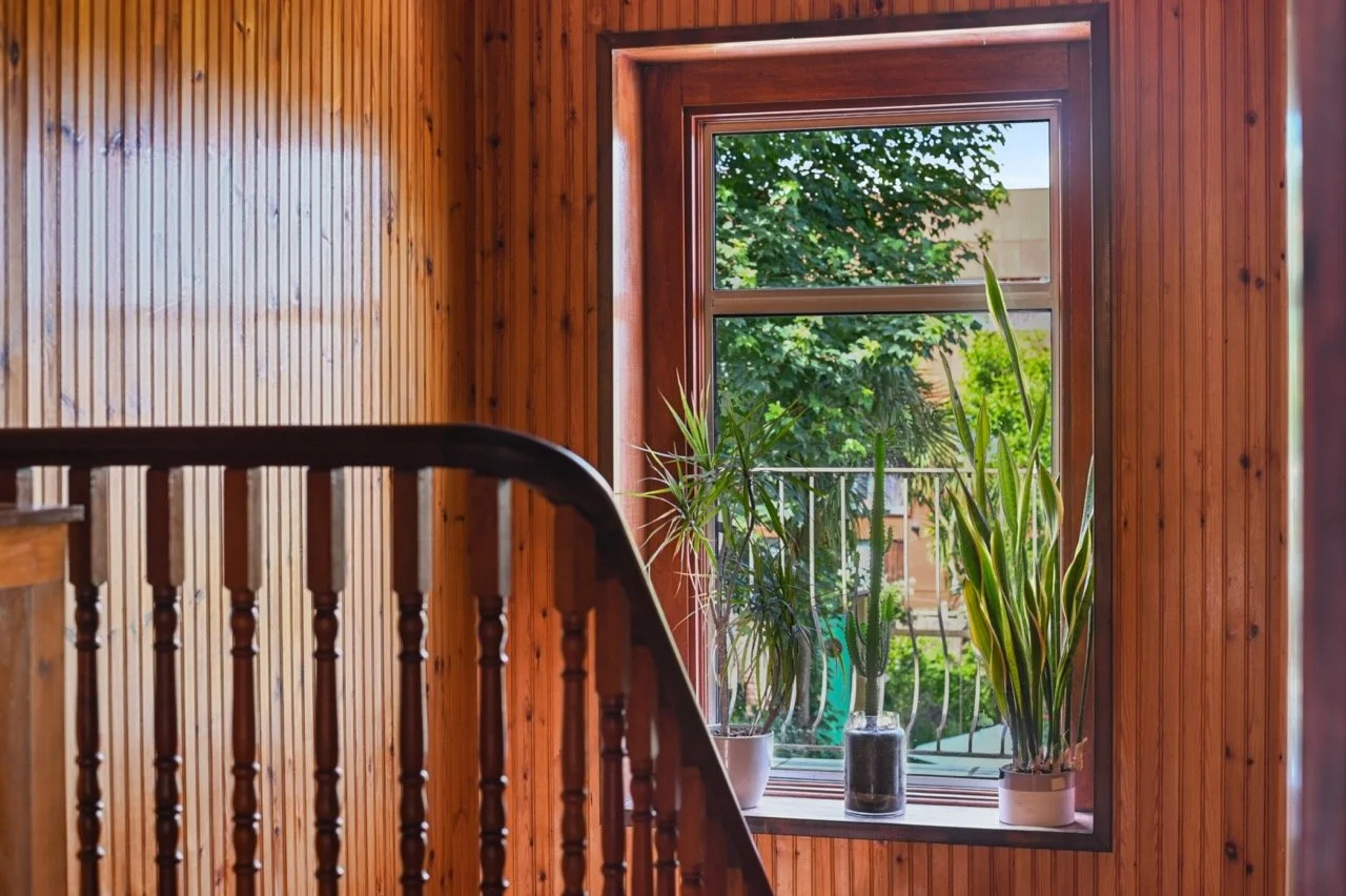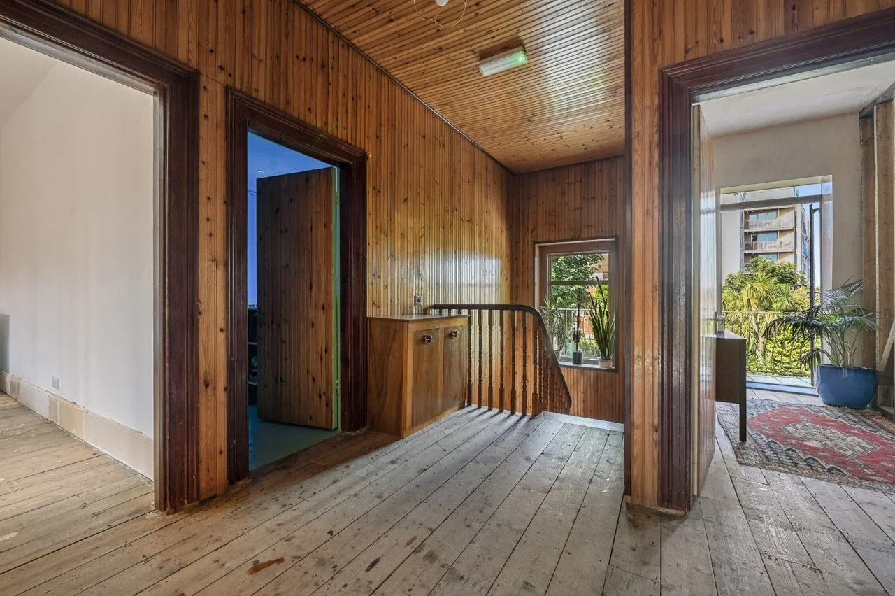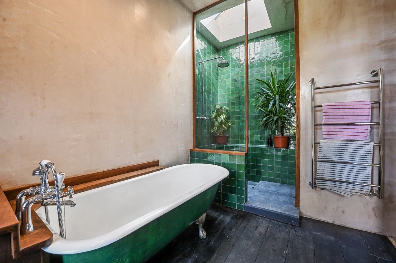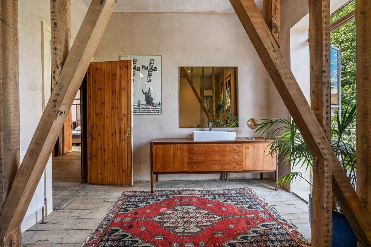 The property boasts high ceilings and large windows throughout. The spacious kitchen, featuring stainless-steel and teak finishes, flows into the dining area with raw brick and limestone walls, black floorboards, and hardwood skirting. The hallways and stairs are reminiscent of 1970s Scandinavian design, with wood-clad walls and an original Victorian tiled floor. Vibrant, playful accents contrast with earthy raw plaster walls and original wooden floorboards.