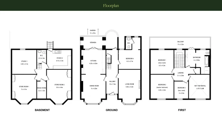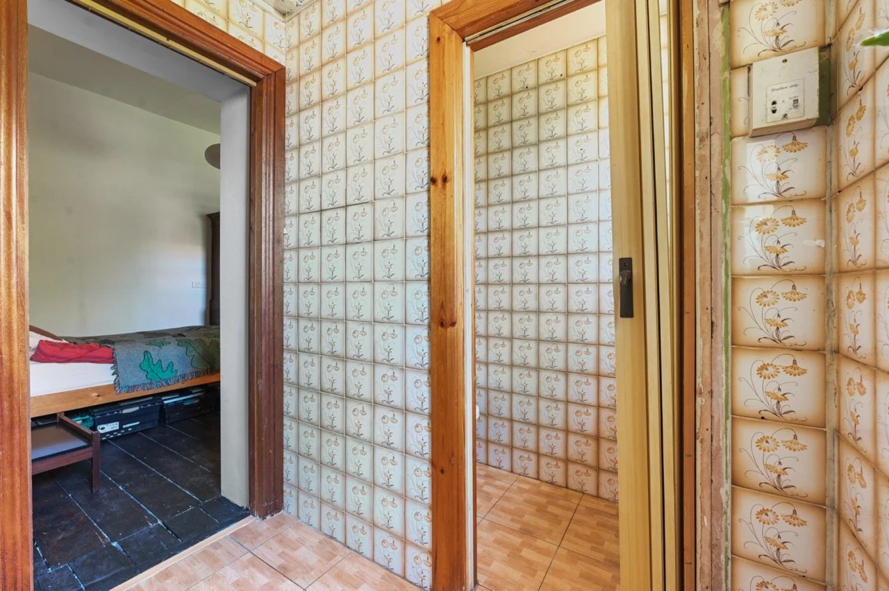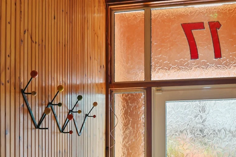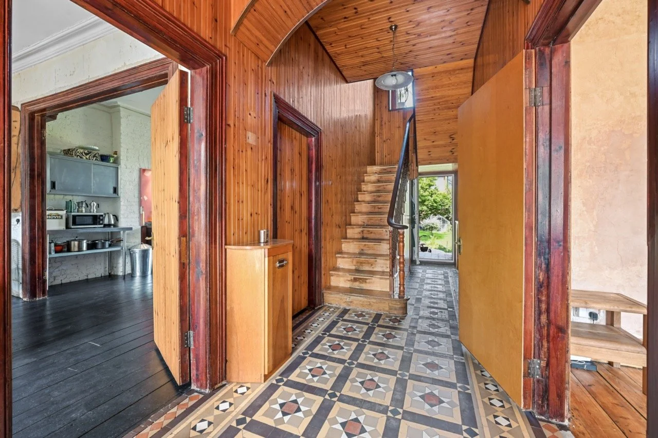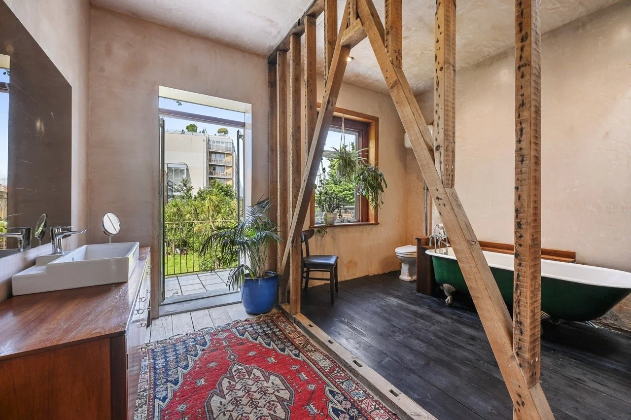 The property boasts high ceilings and large windows throughout. The spacious kitchen, featuring stainless-steel and teak finishes, flows into the dining area with raw brick and limestone walls, black floorboards, and hardwood skirting. The hallways and stairs are reminiscent of 1970s Scandinavian design, with wood-clad walls and an original Victorian tiled floor. Vibrant, playful accents contrast with earthy raw plaster walls and original wooden floorboards.