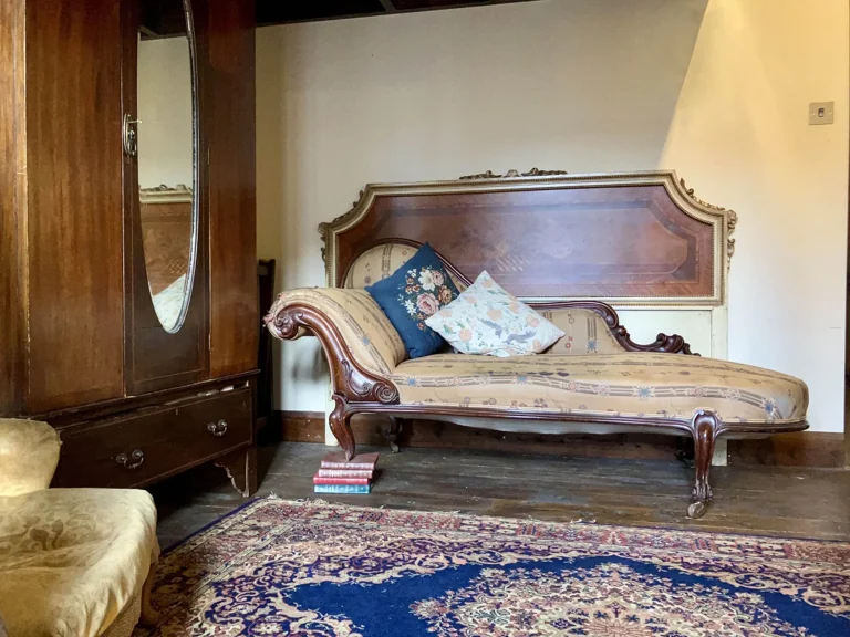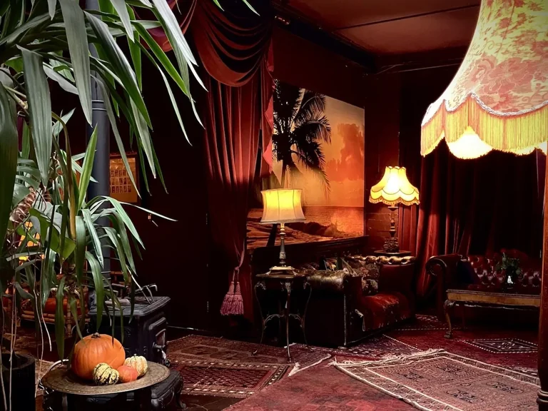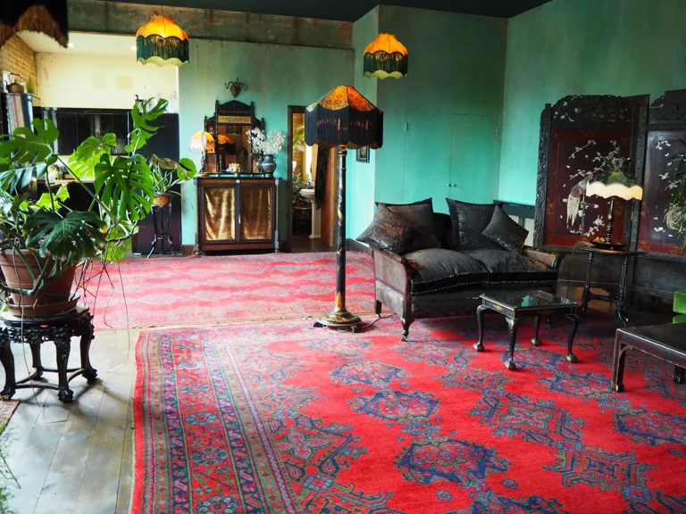 Every corner of the studio exudes an exotic charm, adorned with oriental antiques that tell stories of far-off lands and forgotten eras. Vivid red Turkish carpets sprawl across the 900 sq ft space contrasting dramatically with glossy, lacquered black furniture from the aesthetic movement through to the art deco period. The atmosphere is both luxurious and mysterious. Amber lighting casts a soft, warm glow enhancing the room’s rich colour palette and highlighting the sumptuous textures and finishes. It’s a place where time seems to stand still.