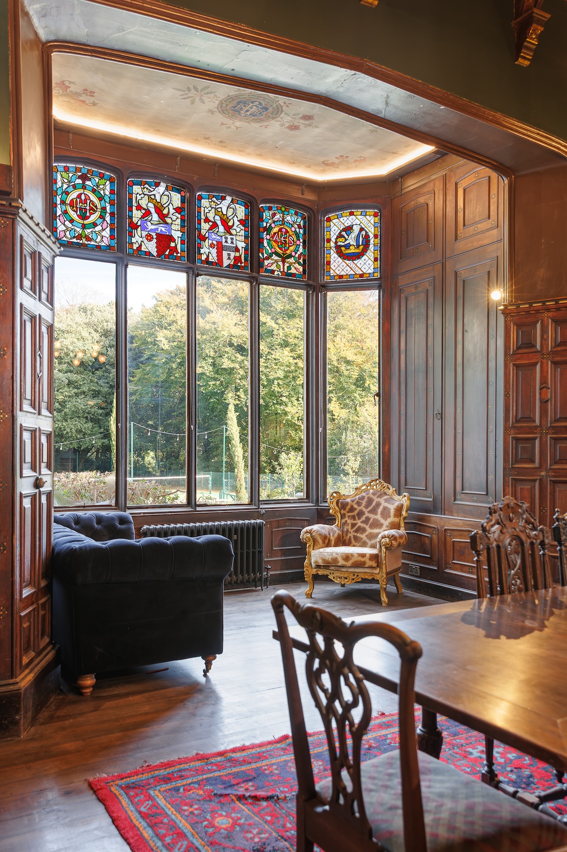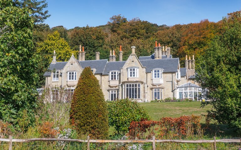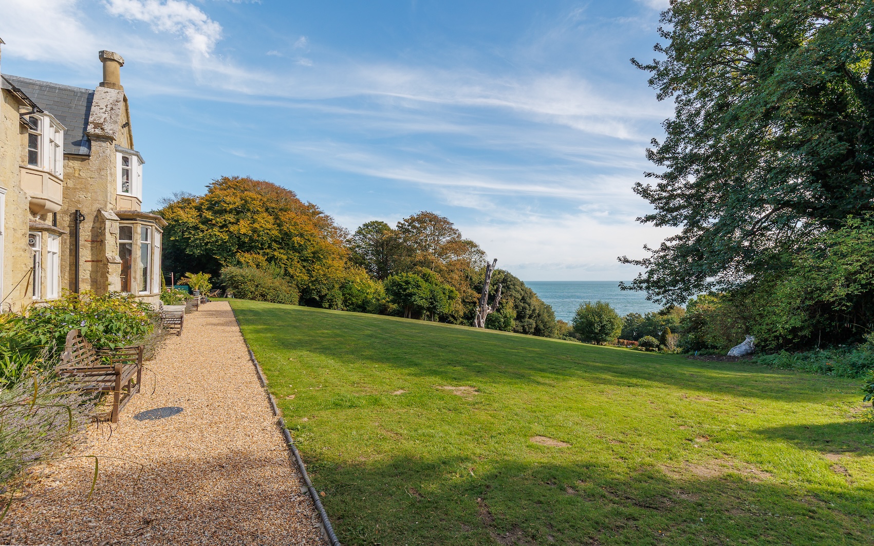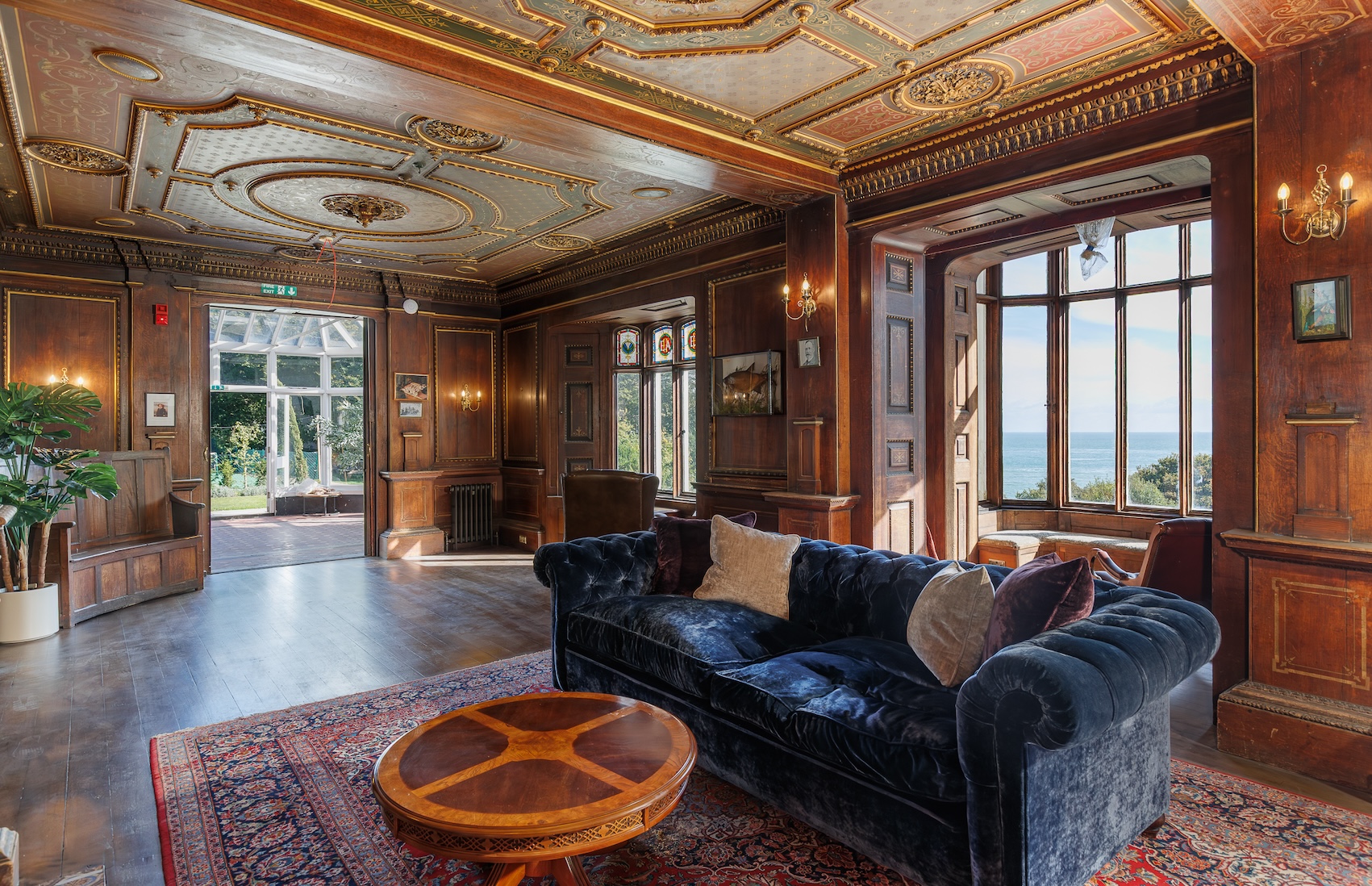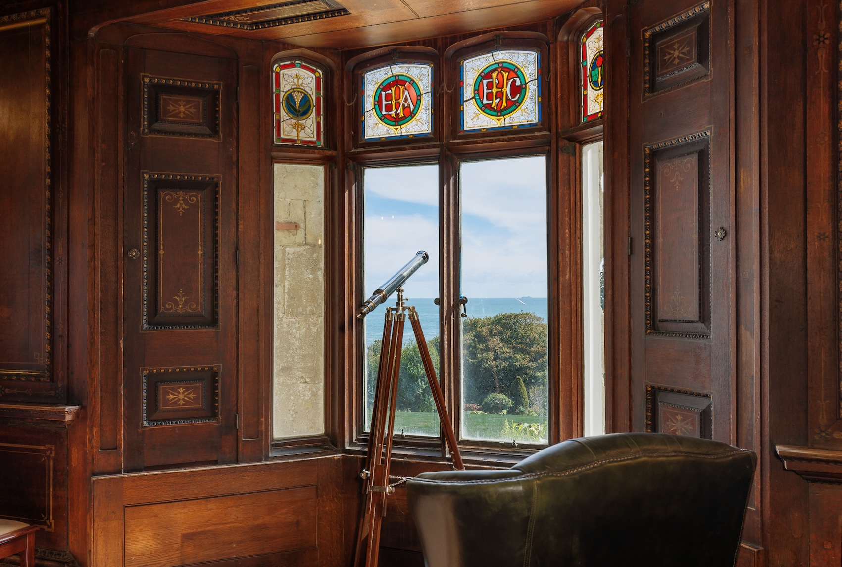 Built from rough-dressed stone, the house is south facing with large floor to ceiling bay windows, many with stained glass, that look down over the rolling lawn to the sea. There is a conservatory at the southeast corner, which faces a large cleared area which extends up to woodland. If you follow the lawns down past the old swimming pool to the bottom field there is a footpath that leads you to the beach at Monks Bay. Inside the property there are a host of original Victorian features which provide multiple backdrops to shoot. From original floorboards, carved and elaborately tiled fireplaces, wood-panelled walls, stained glass, large bay windows and beautifully painted ceilings.