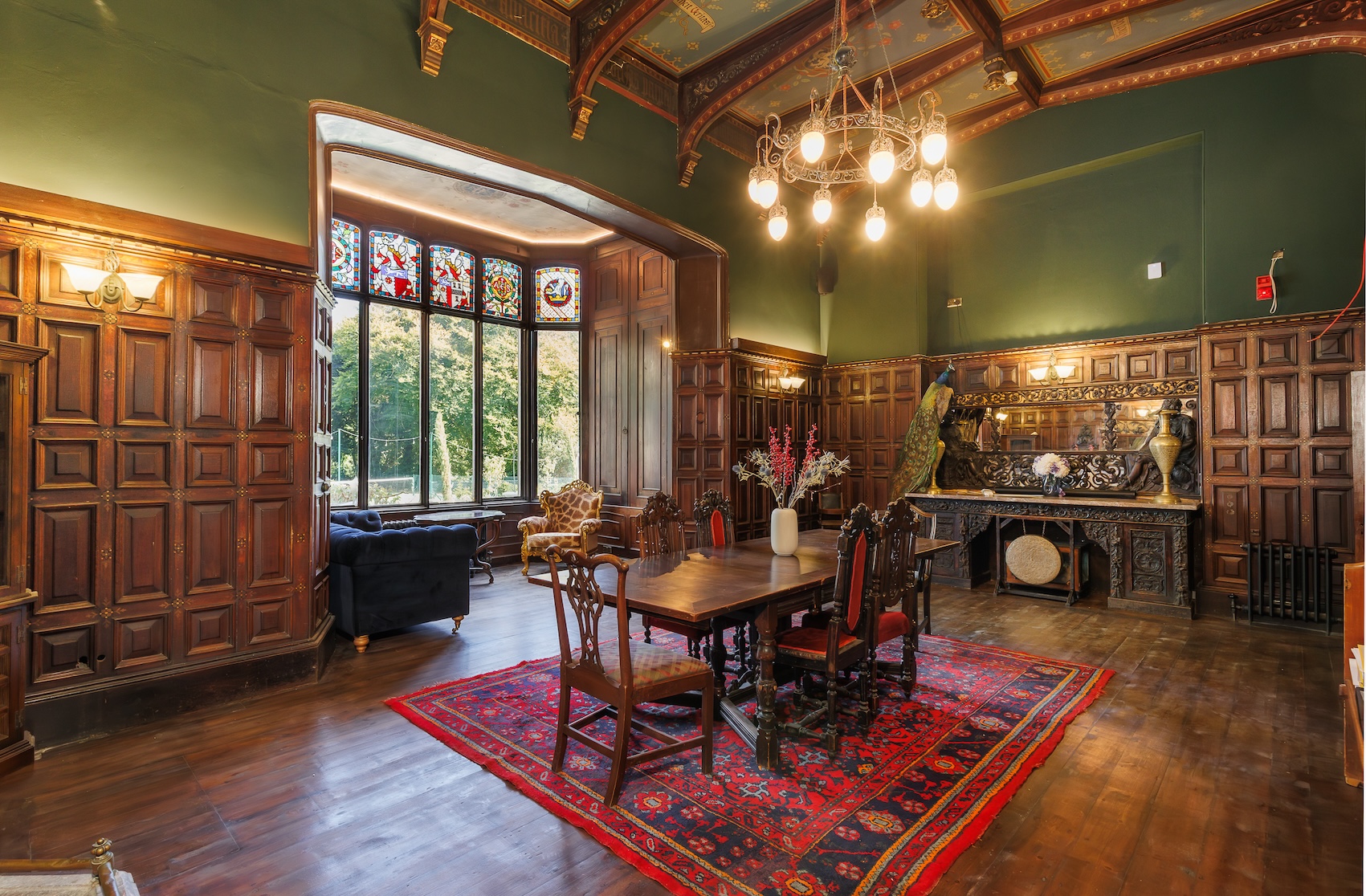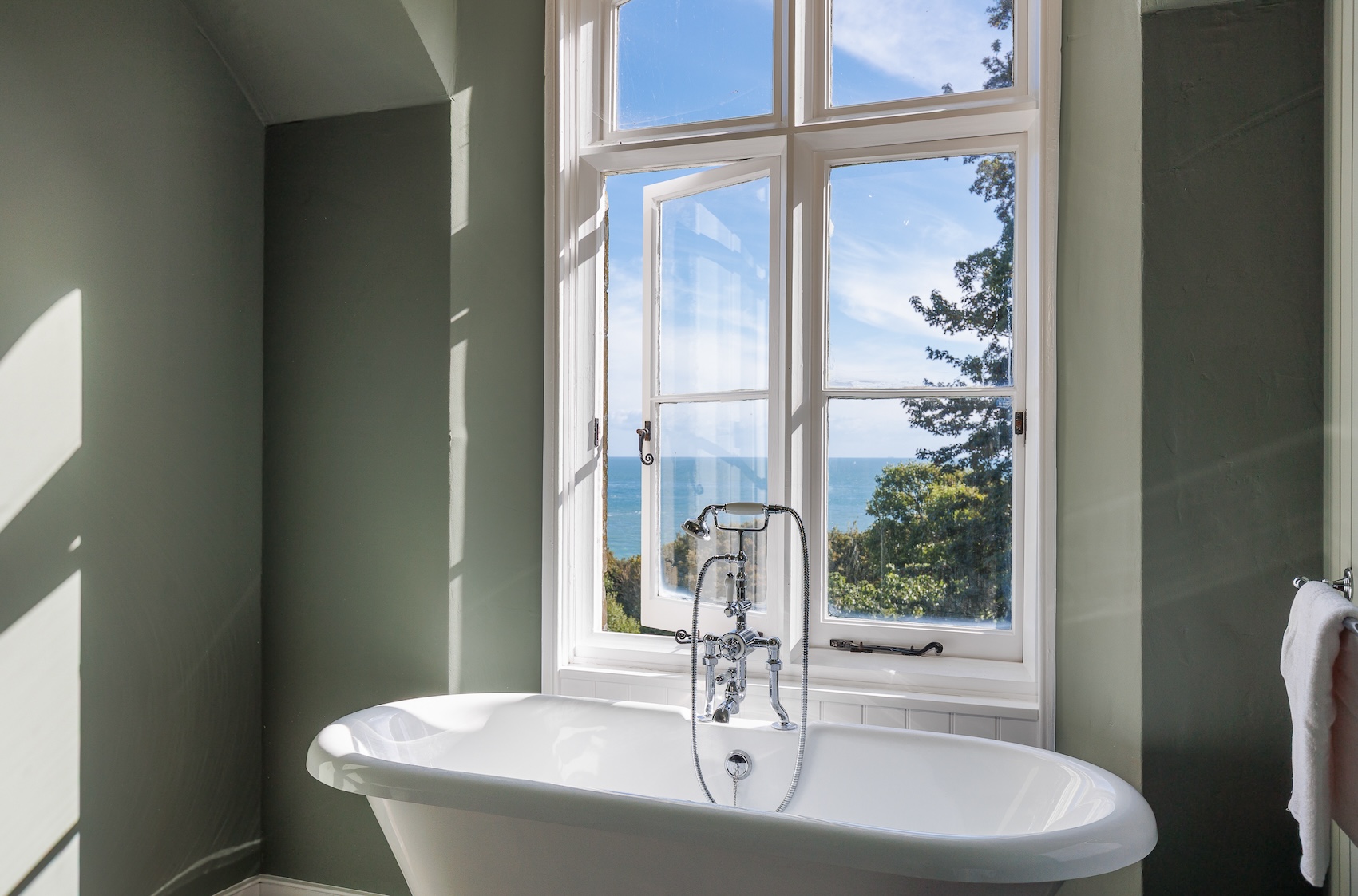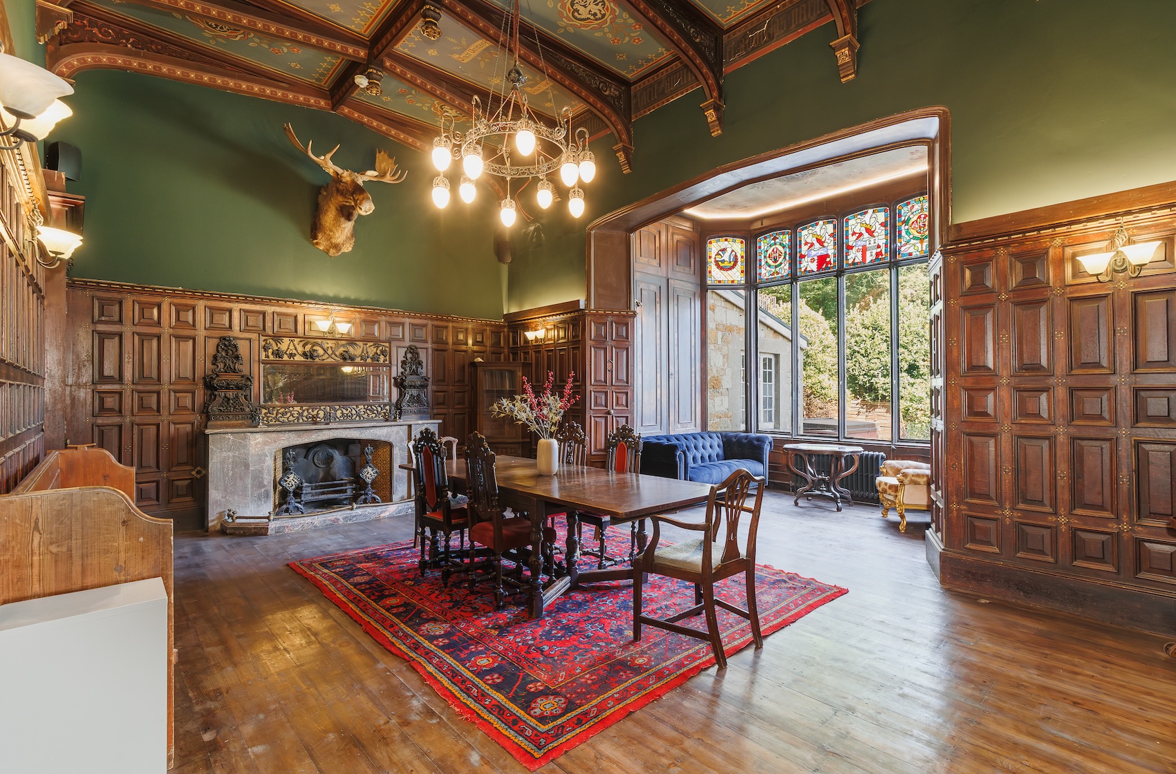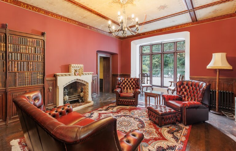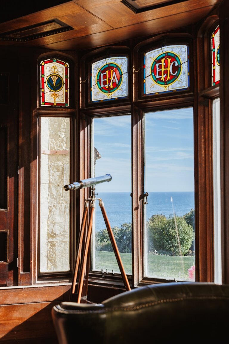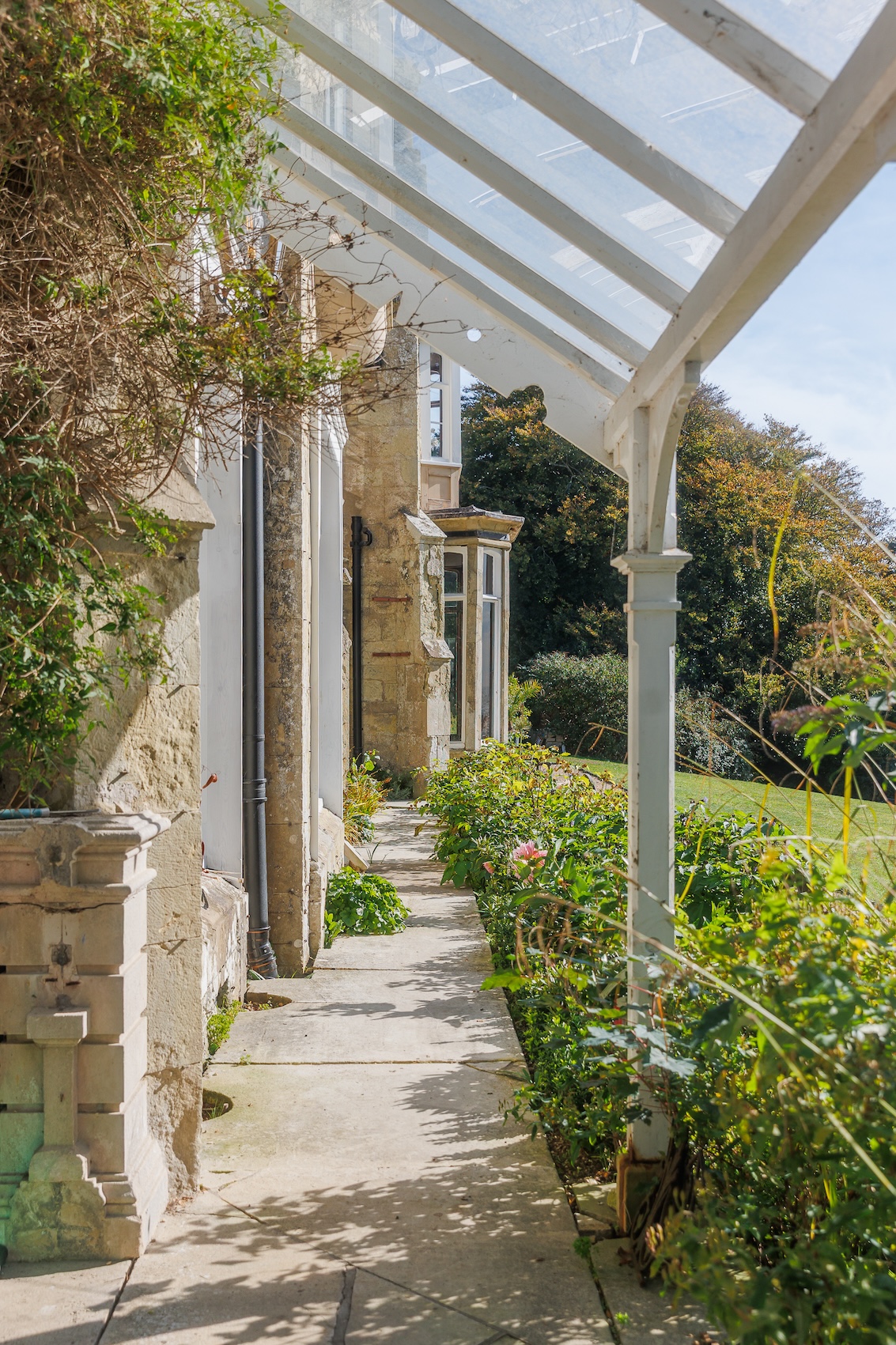 Built from rough-dressed stone, the house is south facing with large floor to ceiling bay windows, many with stained glass, that look down over the rolling lawn to the sea. There is a conservatory at the southeast corner, which faces a large cleared area which extends up to woodland. If you follow the lawns down past the old swimming pool to the bottom field there is a footpath that leads you to the beach at Monks Bay. Inside the property there are a host of original Victorian features which provide multiple backdrops to shoot. From original floorboards, carved and elaborately tiled fireplaces, wood-panelled walls, stained glass, large bay windows and beautifully painted ceilings.