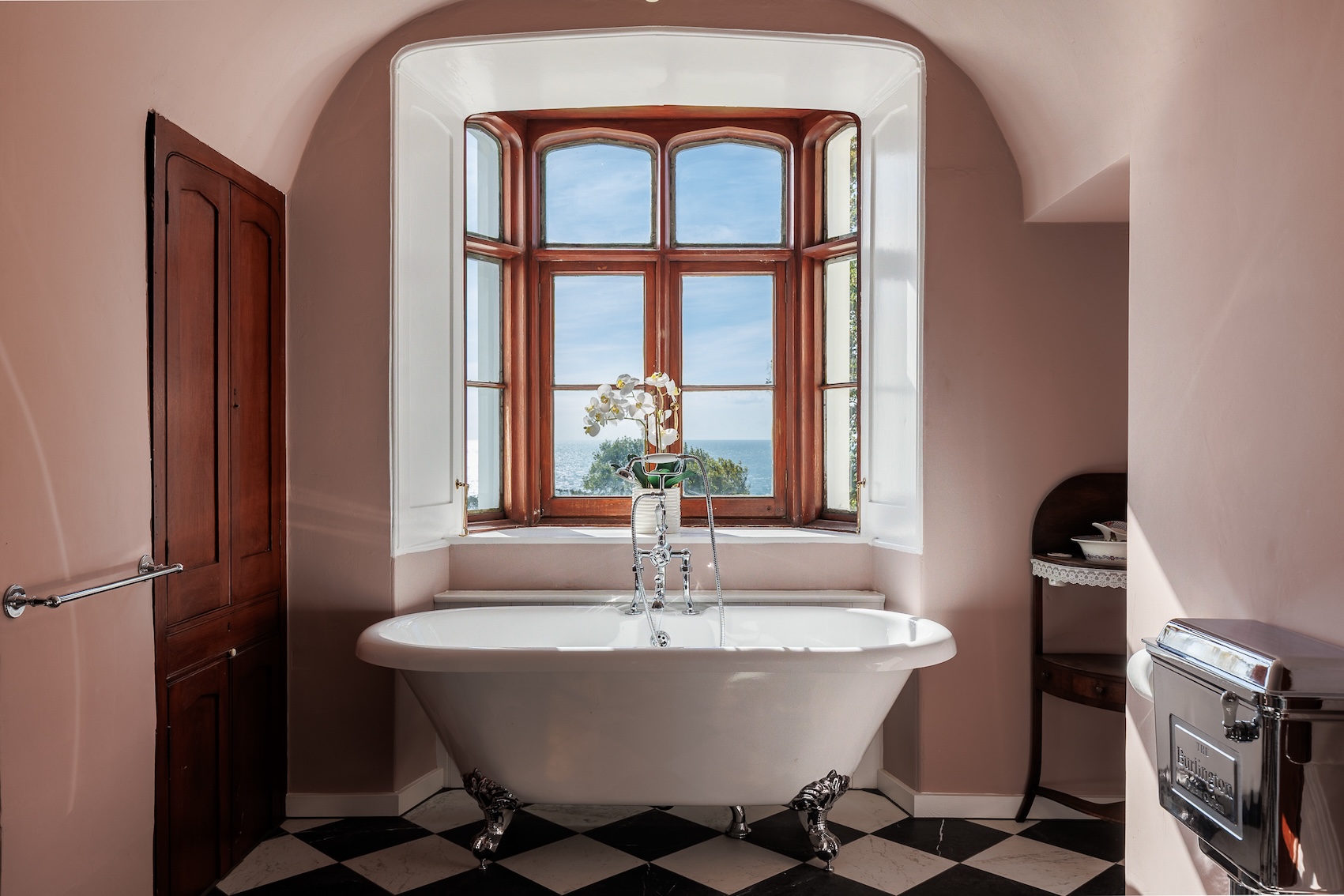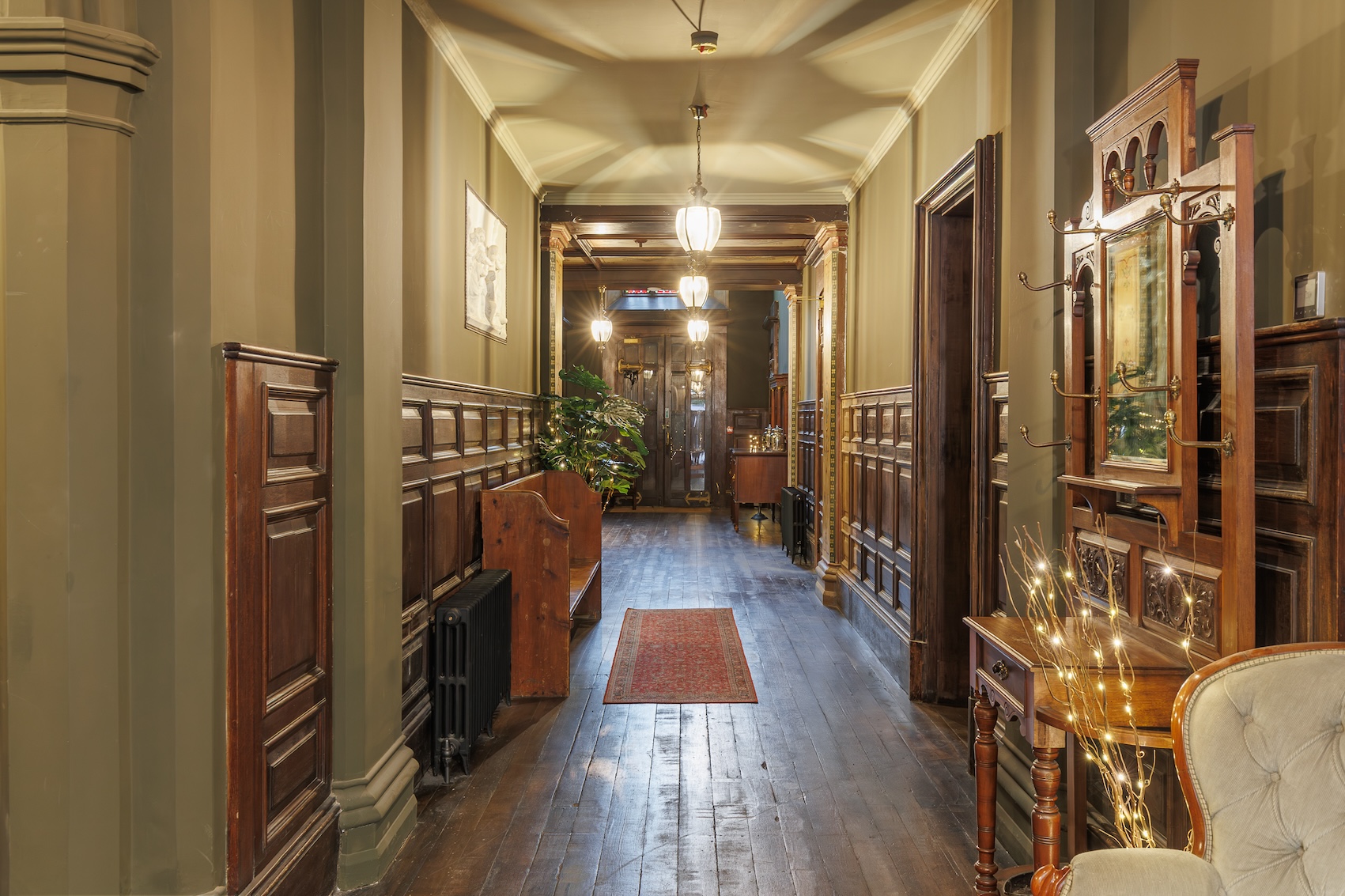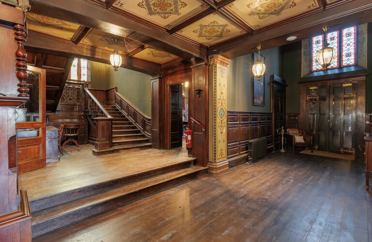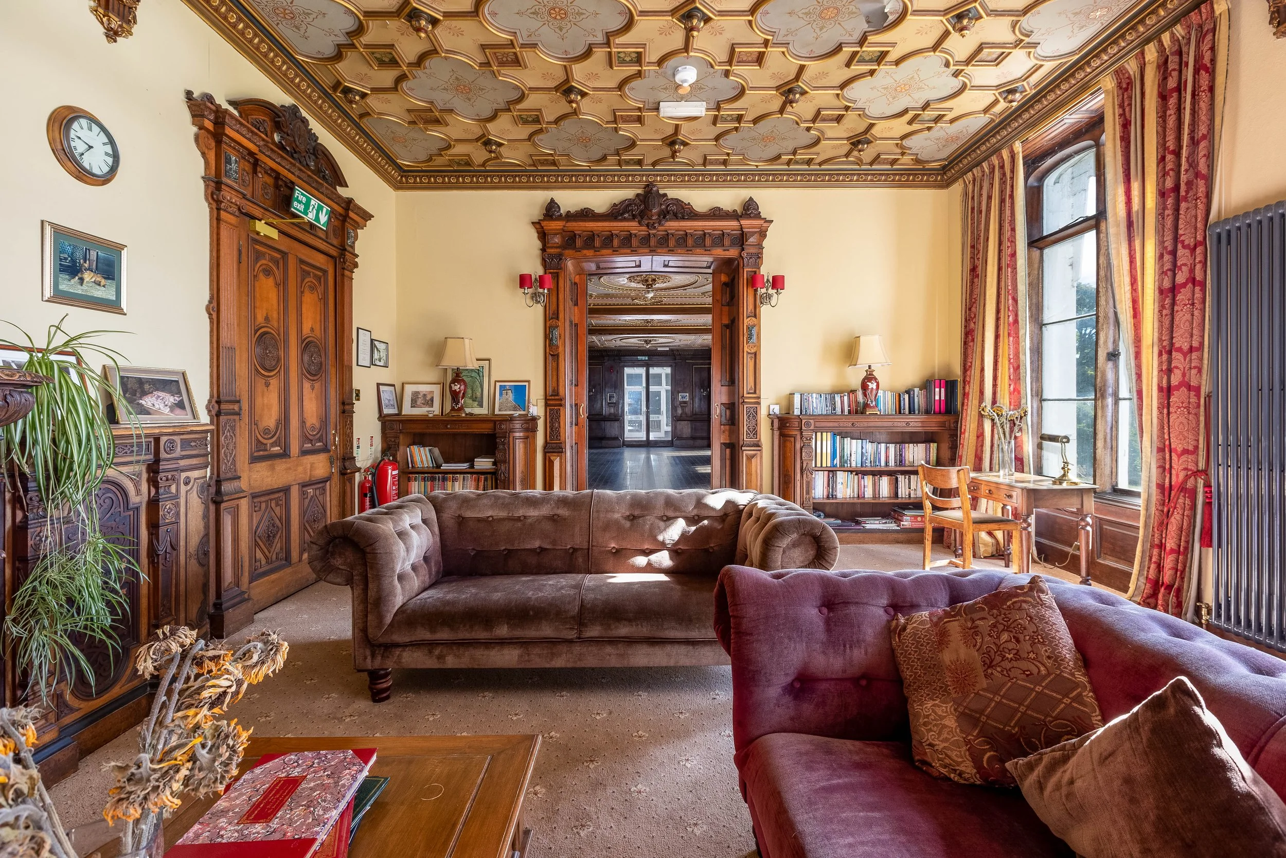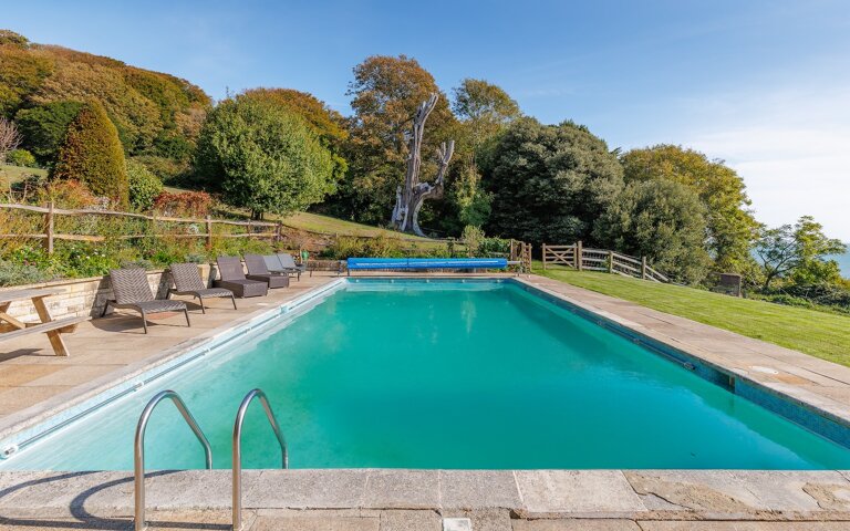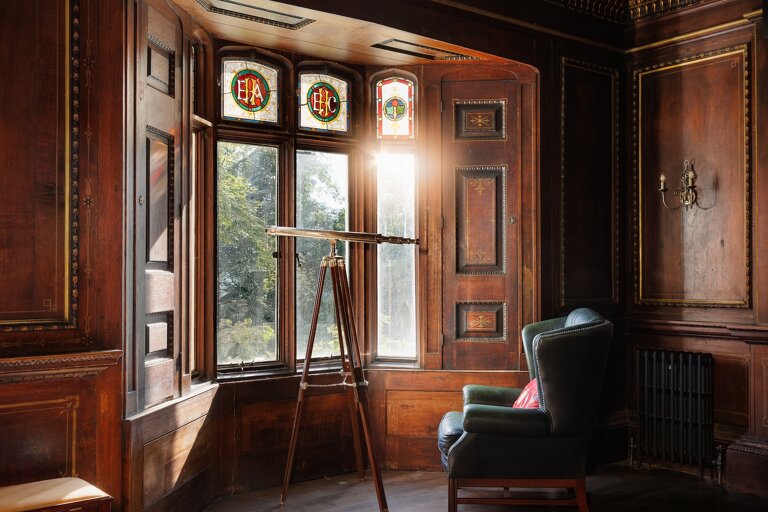Built from rough-dressed stone, the house is south facing with large floor to ceiling bay windows, many with stained glass, that look down over the rolling lawn to the sea. There is a conservatory at the southeast corner, which faces a large cleared area which extends up to woodland. If you follow the lawns down past the old swimming pool to the bottom field there is a footpath that leads you to the beach at Monks Bay. Inside the property there are a host of original Victorian features which provide multiple backdrops to shoot. From original floorboards, carved and elaborately tiled fireplaces, wood-panelled walls, stained glass, large bay windows and beautifully painted ceilings.