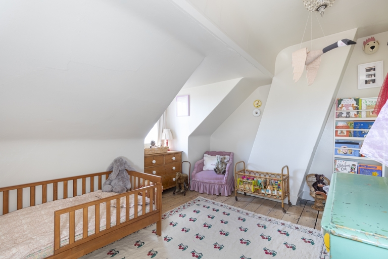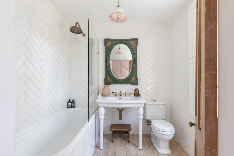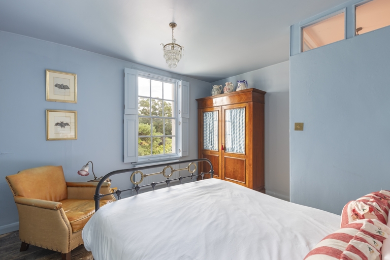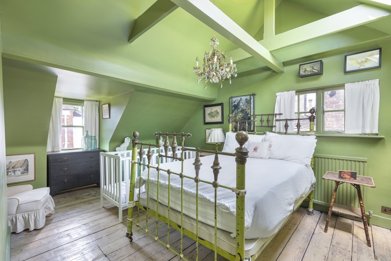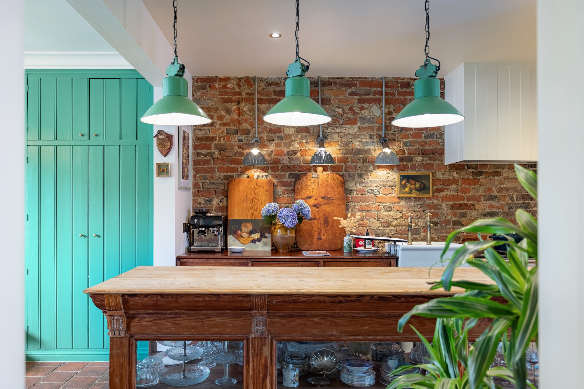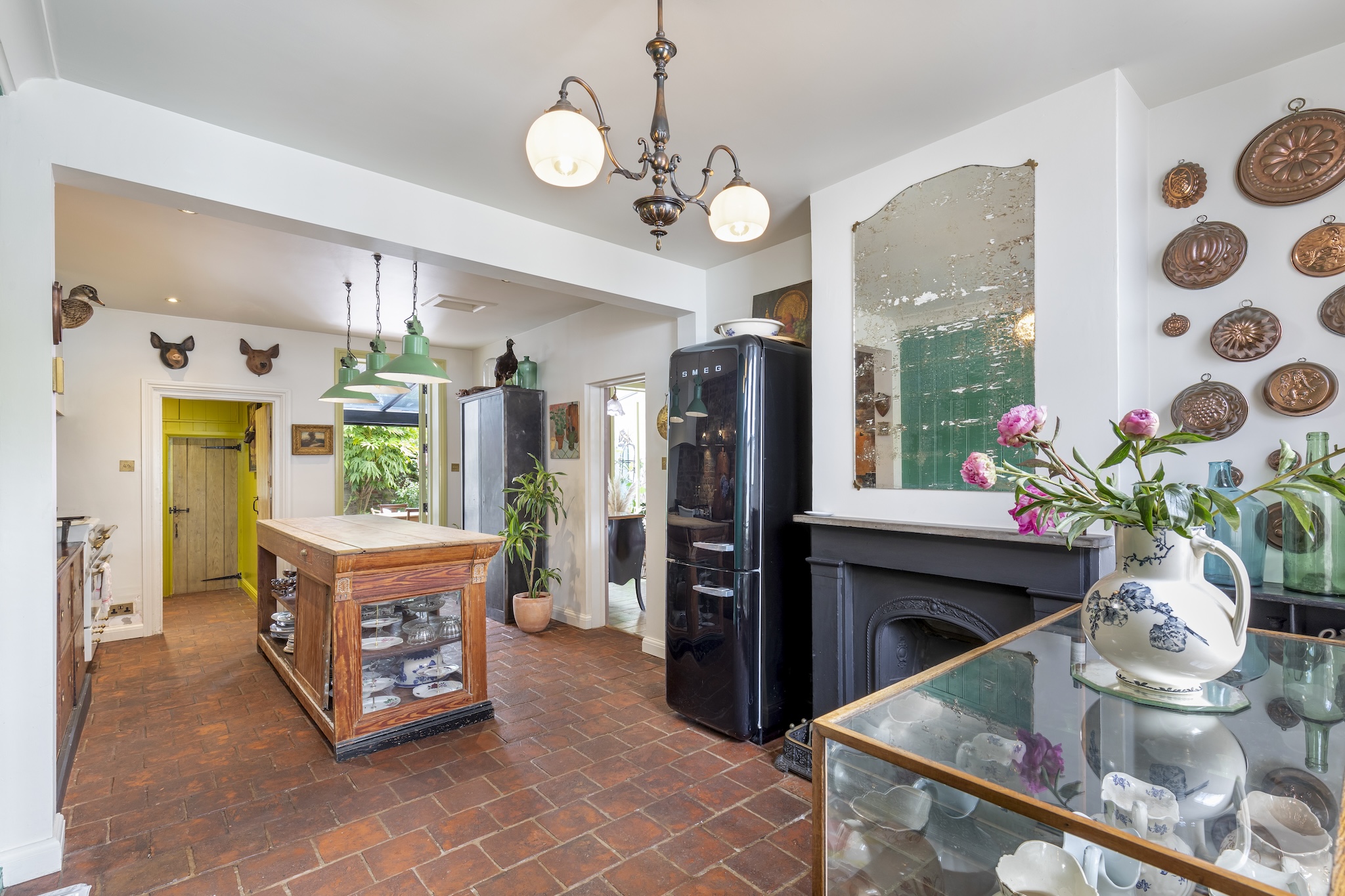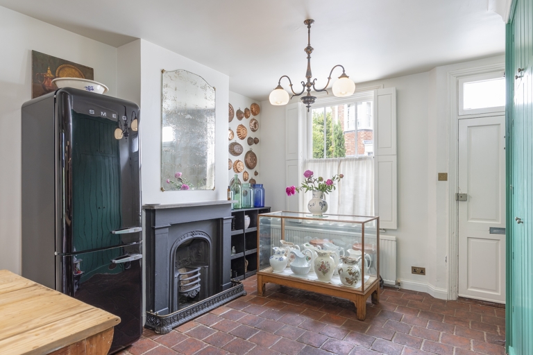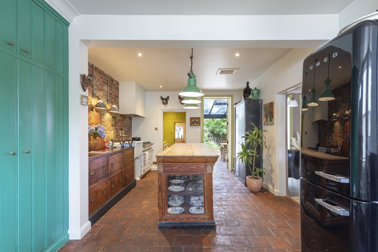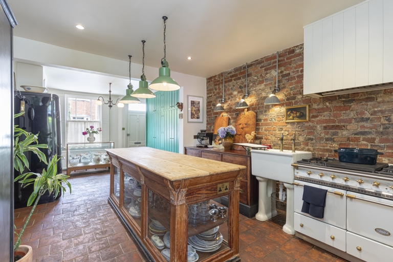 The kitchen is a standout feature, centred around a striking antique French glass cabinet that serves as the island, and complemented by original draper’s drawers and a Victorian fireplace that adds warmth and period charm