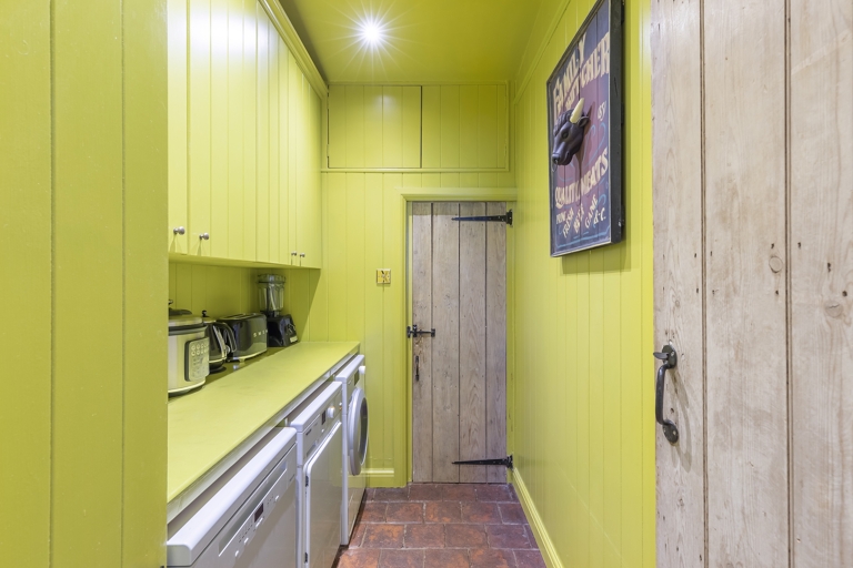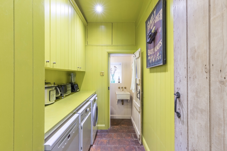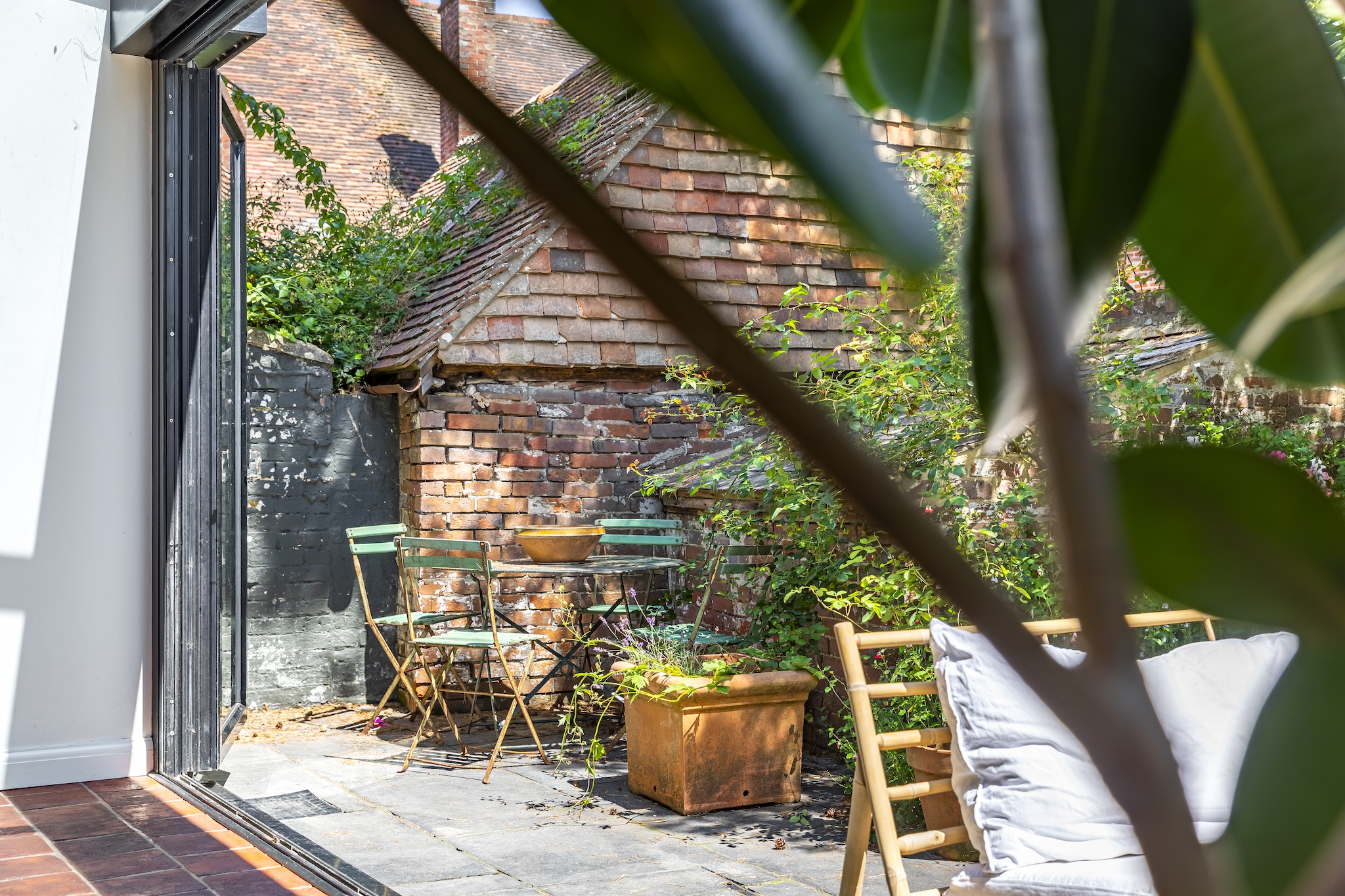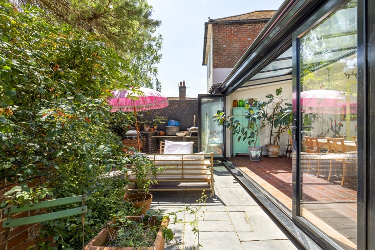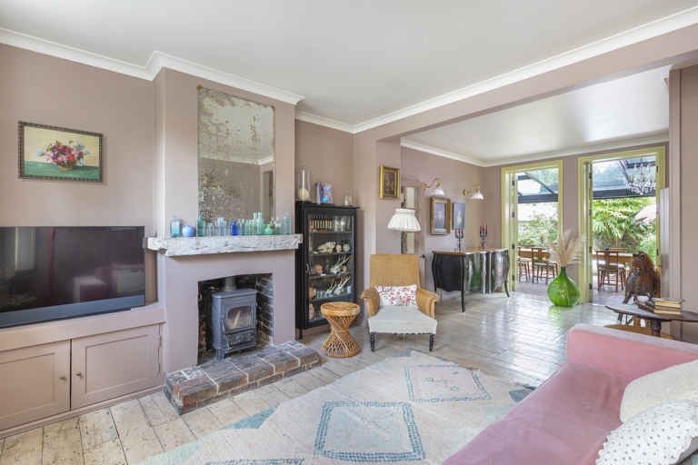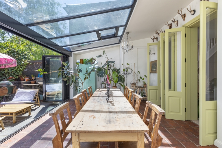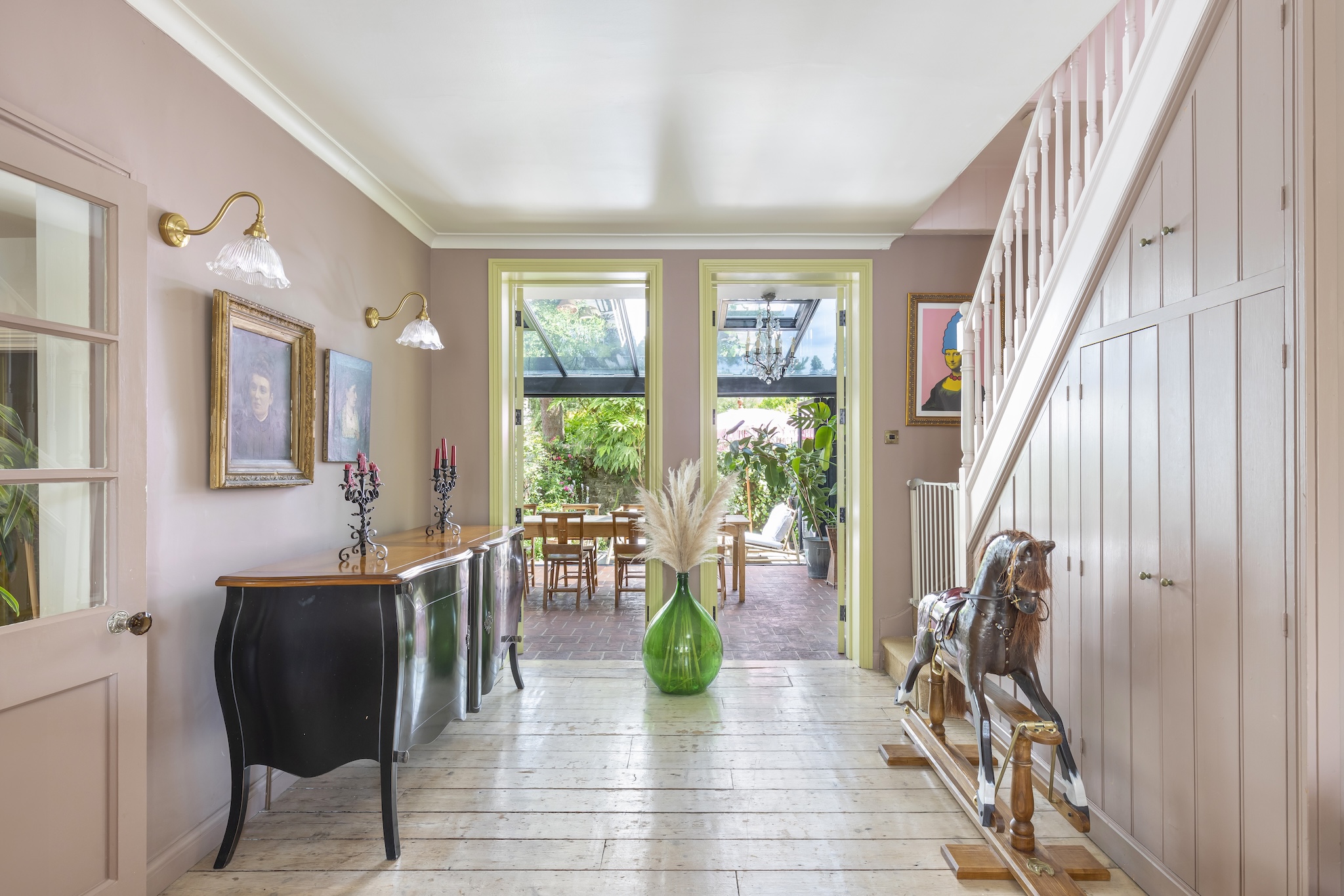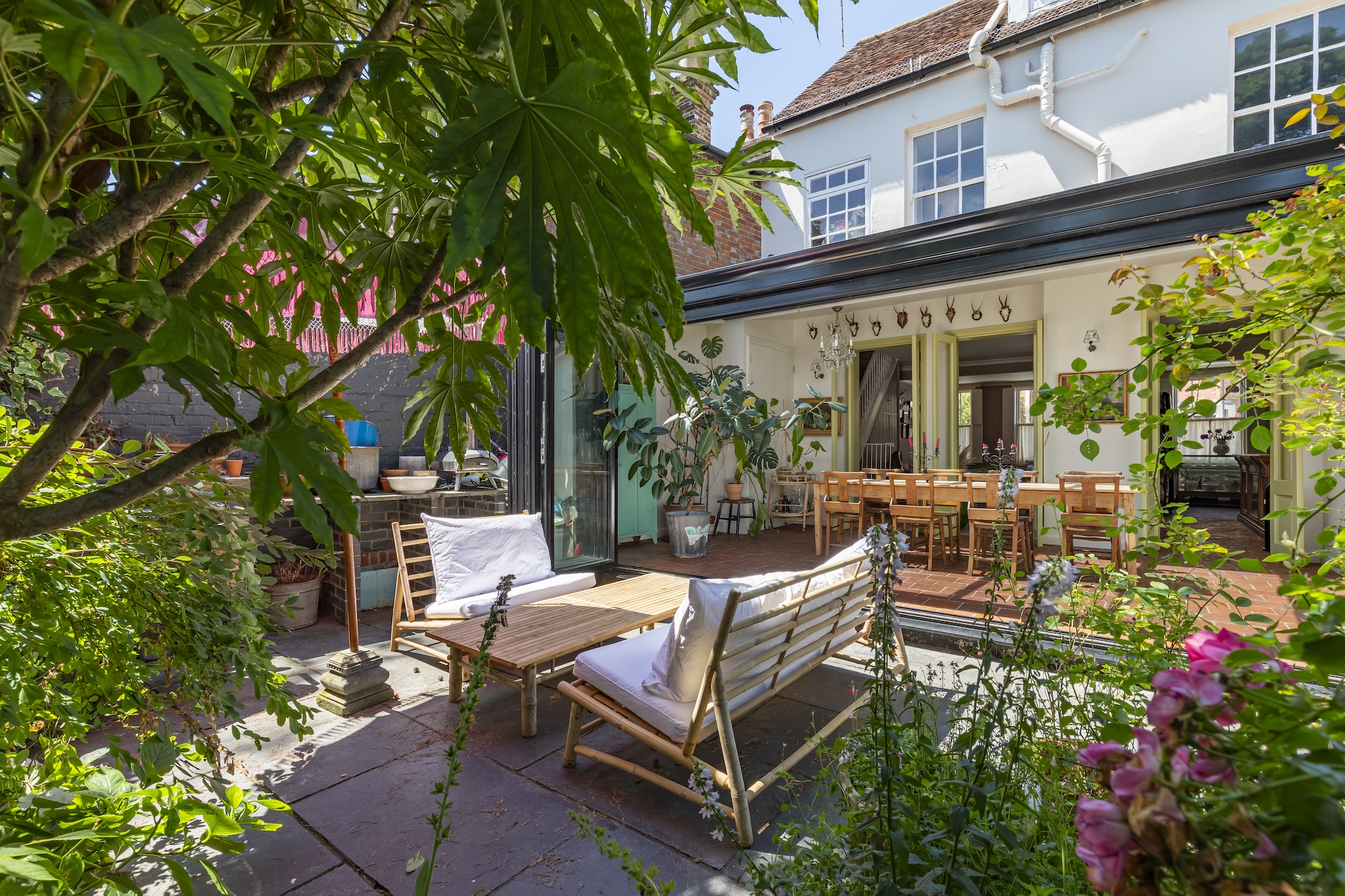 At the rear of the property, a stunning garden room runs the full length of the house, opening out onto a private walled courtyard garden—an ideal setting for elegant outdoor dining shoots.