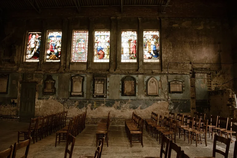 Once forgotten, characterfully dilapidated and distressed, with crumbling paintwork, stunning stained-glass windows and ethereal dancing shadows.