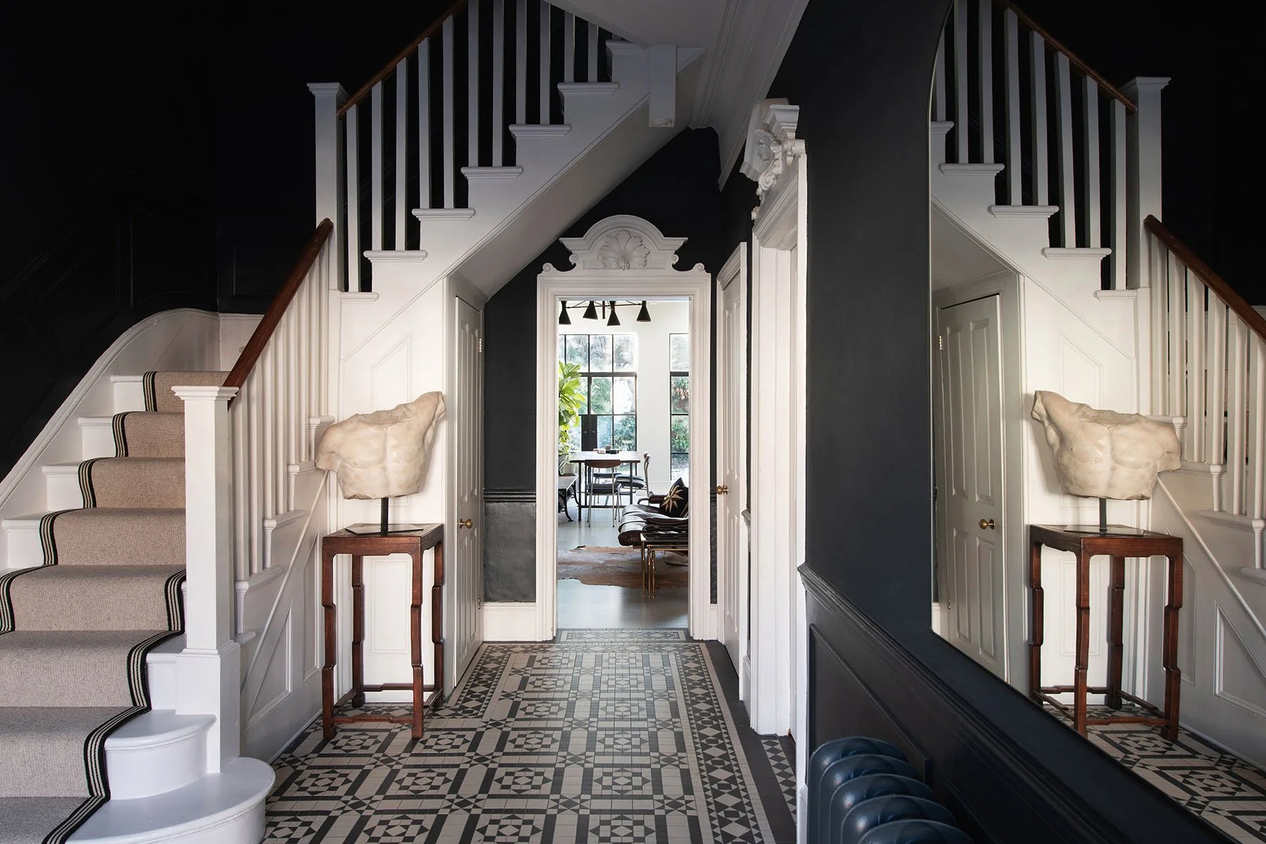 A Victorian tiled pathway leads through the front garden to a beautiful stained glass front door and side window with an open porch. The ground floor comprises a large square entrance hall with Victorian tiles and fireplace, with stairs leading up to the first floor.