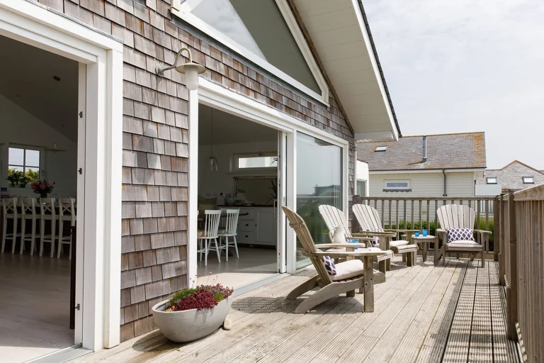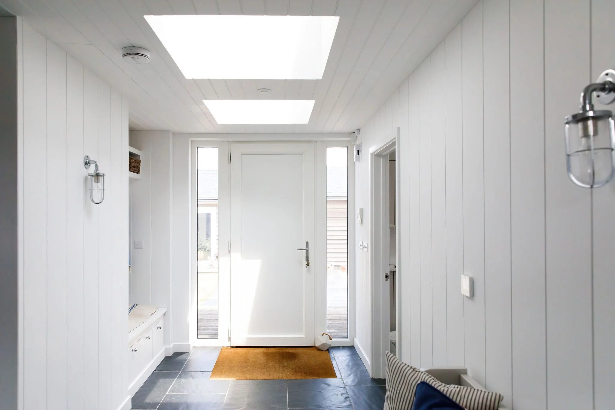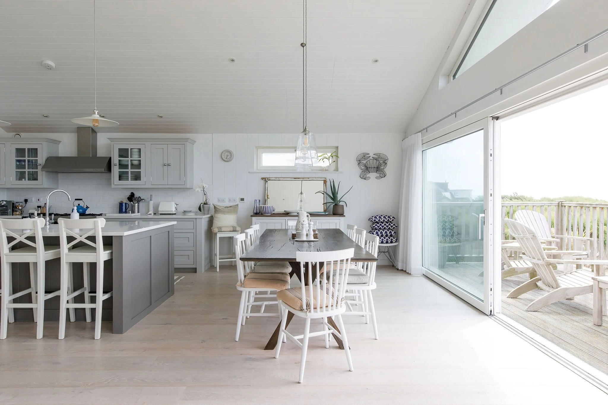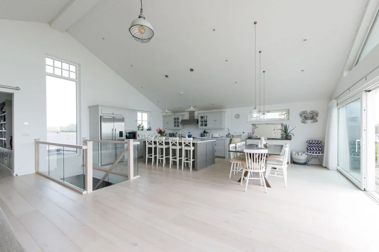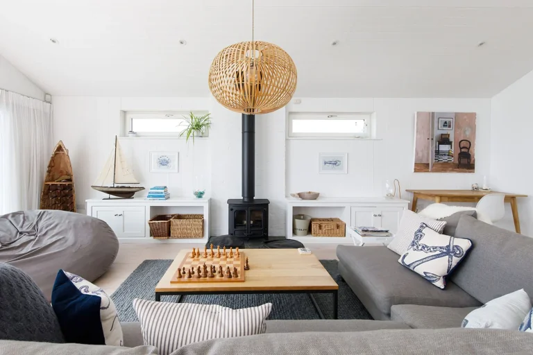 A unique upside-down layout ensures that the stylish open-plan living area maximizes the breathtaking sea views. The main room boasts a stunning vaulted ceiling, with floor-to-ceiling windows flooding the space with natural light and framing the water. The exterior flaunts a sleek and modern birch-clad facade, there's an inviting warmth and tranquillity that permeates the interior.
