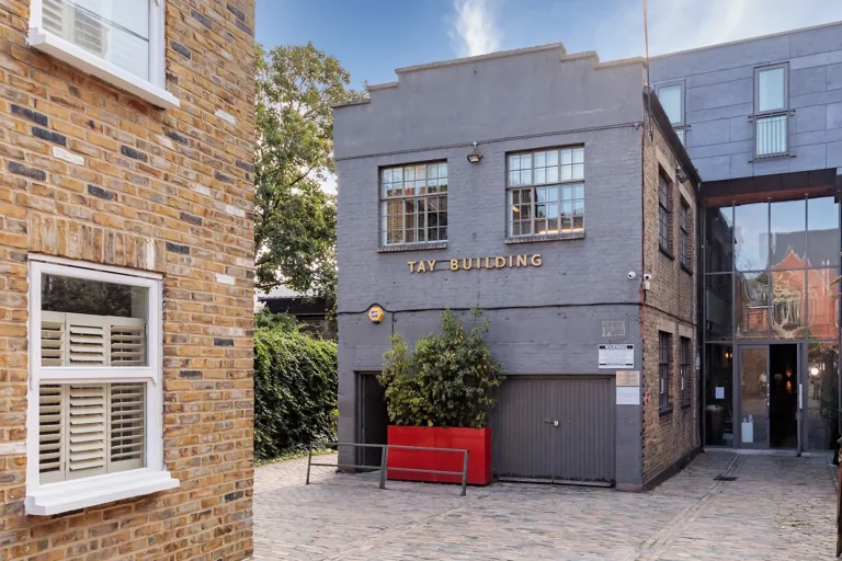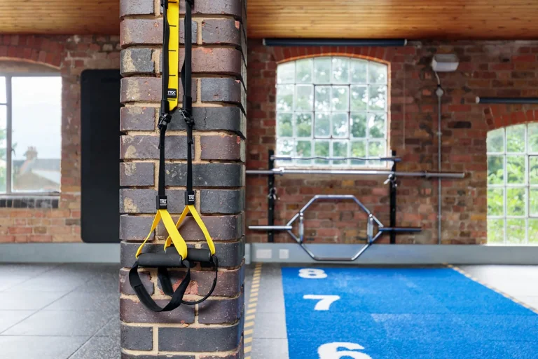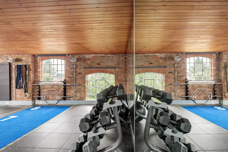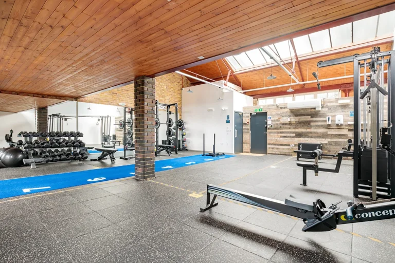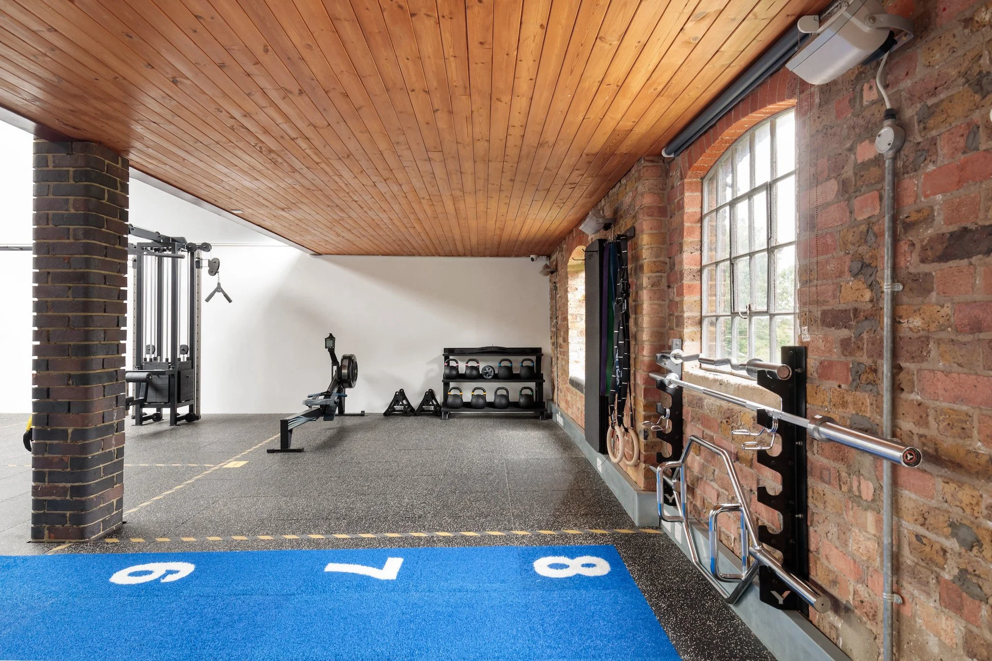 A unique gym that has recently undergone renovation, boasting a loft-style design that showcases exposed brickwork, wood-panelled ceilings, metal beams, and sleek dark tiled rubber flooring.