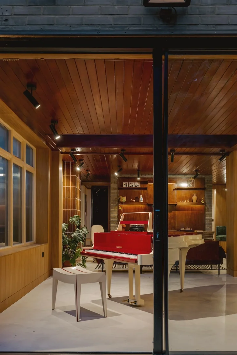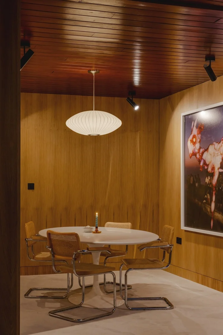 Recently restored to its original splendor, the house serves as an exceptional location for contemporary photo shoots or as a period home that beautifully reflects the design aesthetics of the 1950s, 1960s, and 1970s. The property, including its outbuildings, encompasses nearly 3,000 square feet.