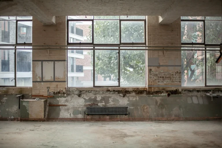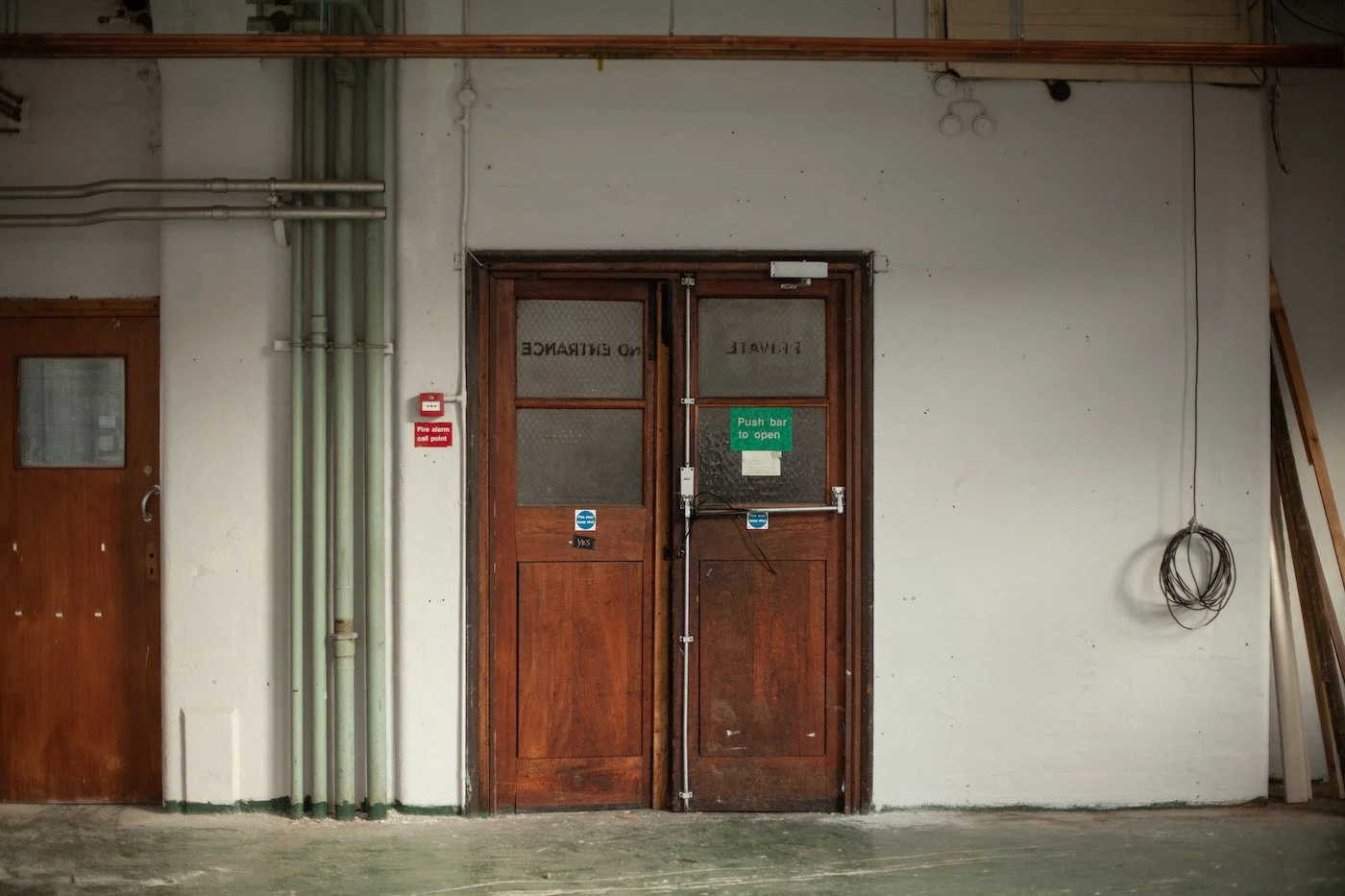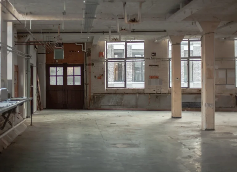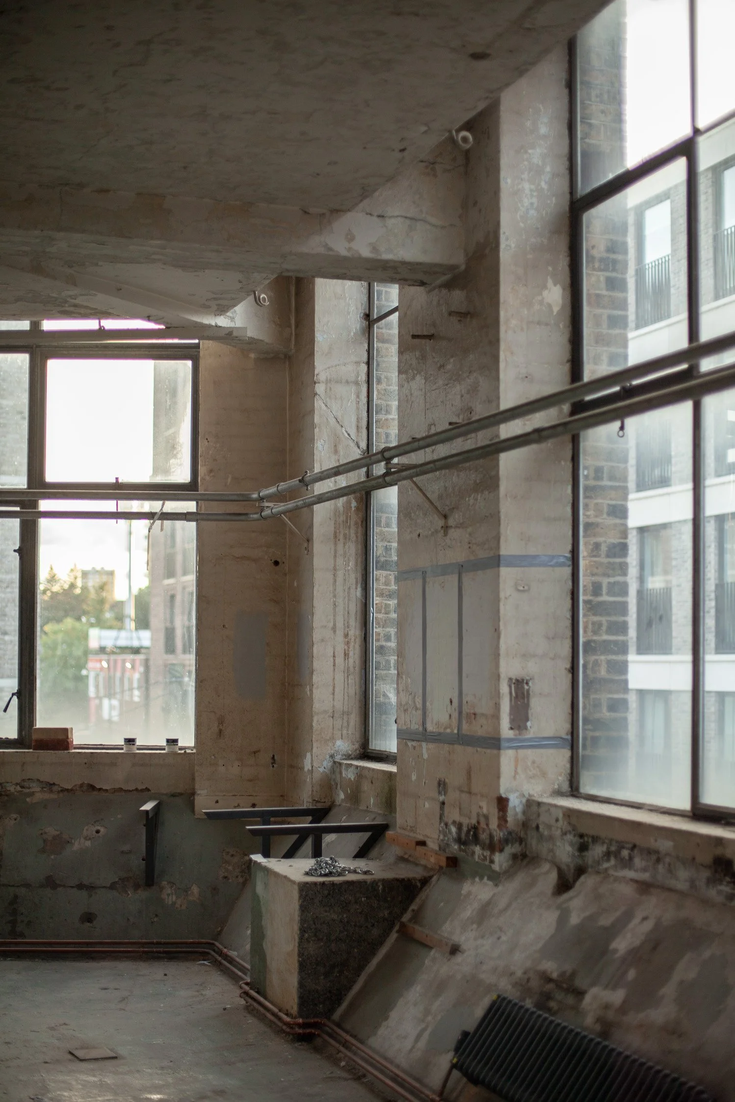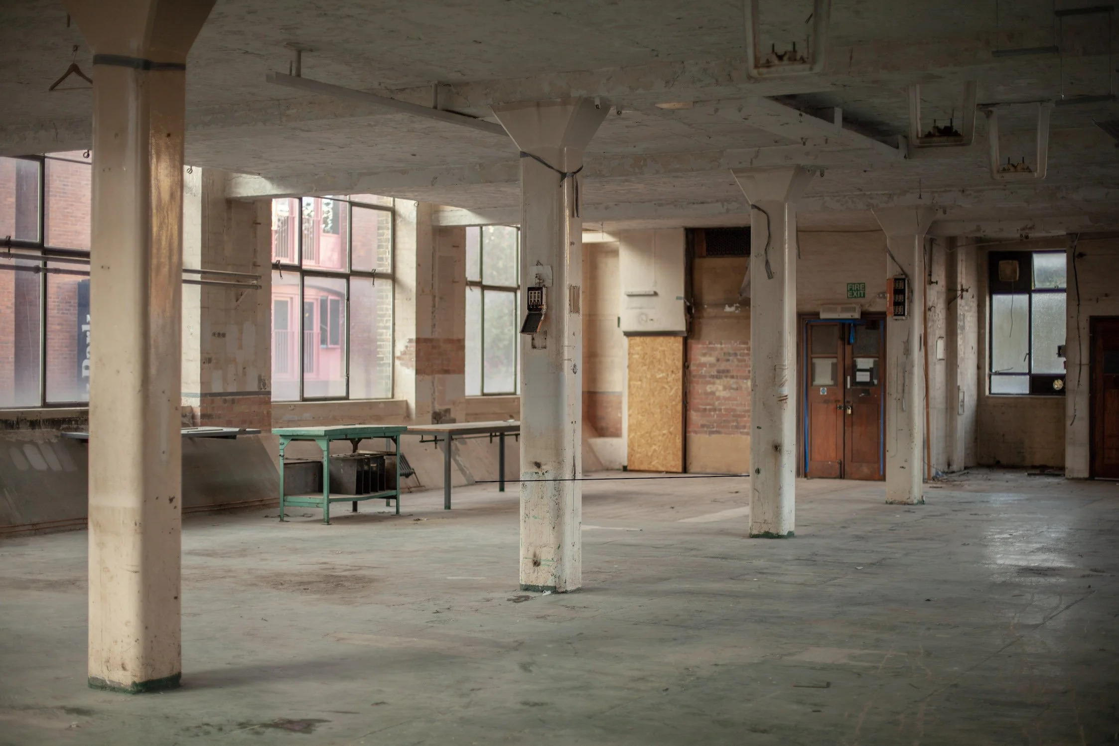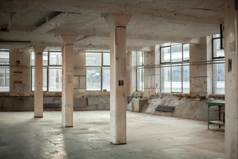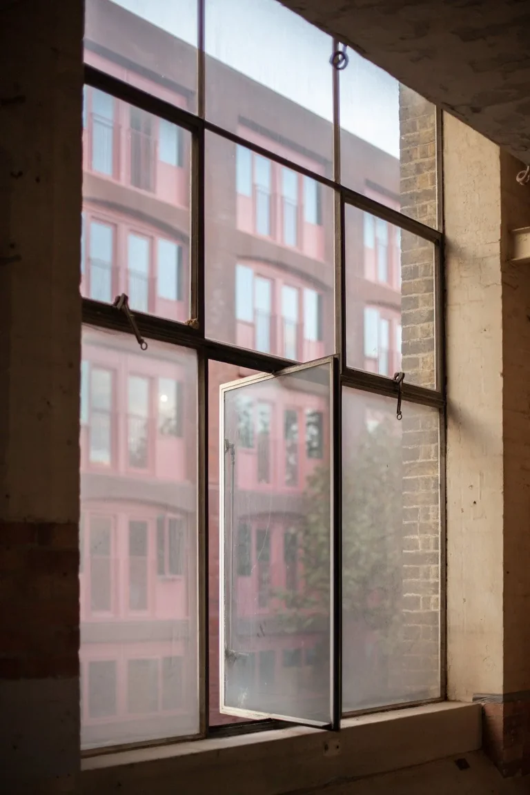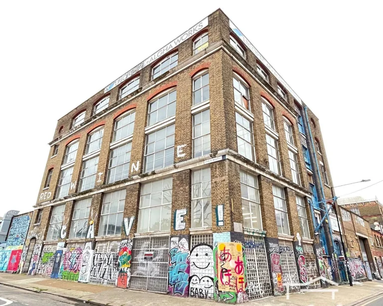 The industrial character of the structure is illustrated in its rhythmic vertical bays, robust brickwork, and vertical tall windows. Utilitarian appearance that lacks decorative features but is rich in character and textures. The space has ravaged concrete, exposed brick walls, and raw concrete floors. The windows are 1930s galvanised steel replacements, allowing for plenty of light, though they can be blacked out if required. A full set of original wooden hatch-rank loading doors in a recessed loading bay under a red-brick segmental arch survive on the southwest elevation.