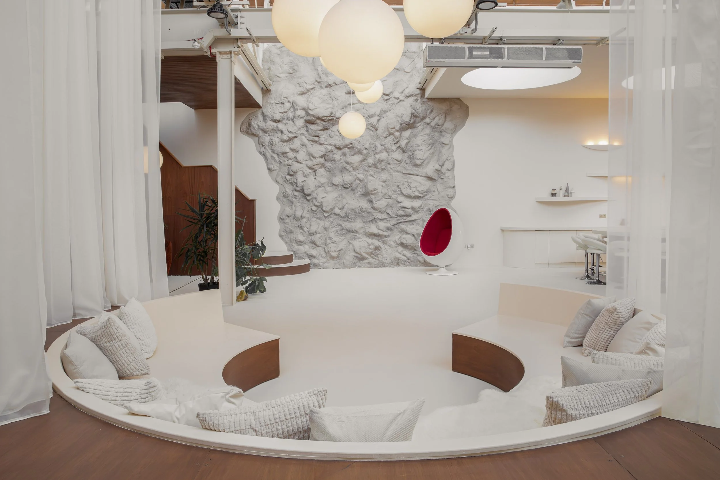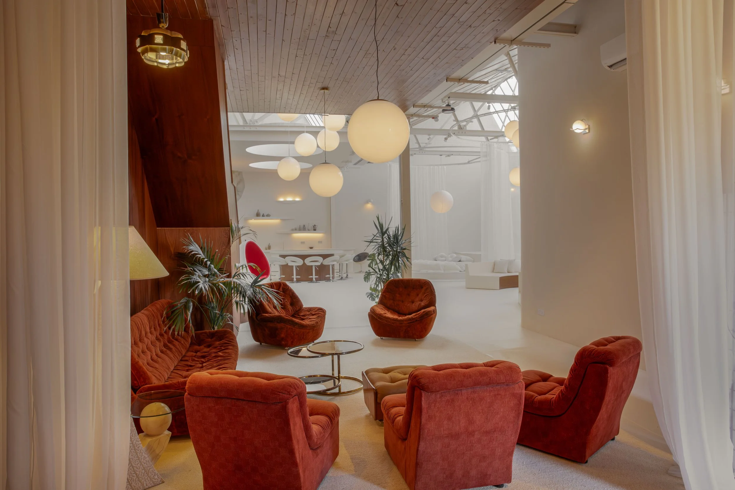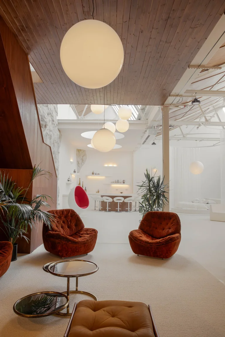 Featuring a spacious open-plan layout and modular furniture, the design of the space seamlessly blends modern sophistication with timeless retro charm, effortlessly transitioning from a Modernist aesthetic to 60’s Space Age or Ibiza Boho chic with a simple change of props. This eclectic location serves as a versatile backdrop for a wide range of design styles, whether utilized in its current state or reconfigured to suit specific needs.