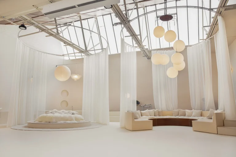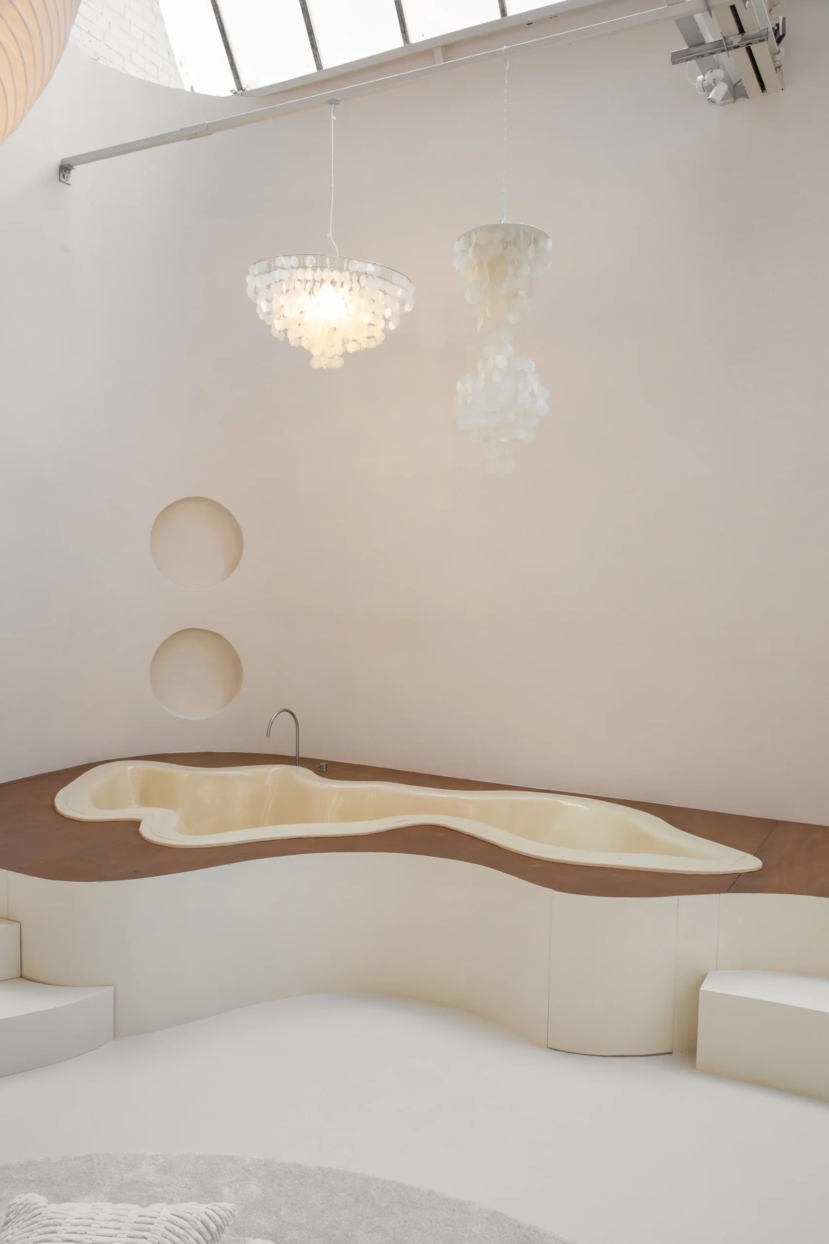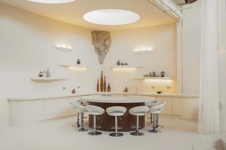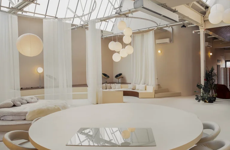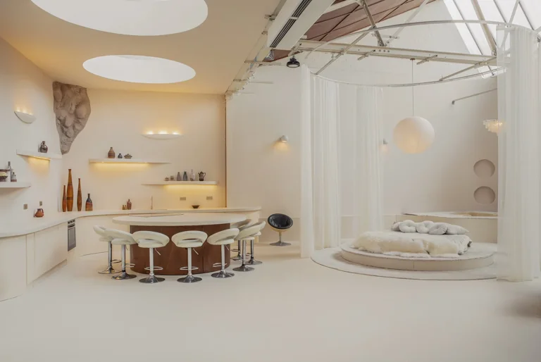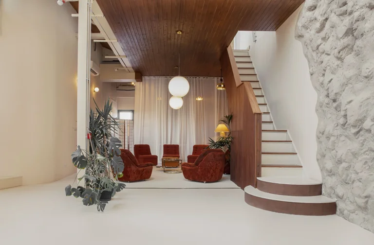 Featuring a spacious open-plan layout and modular furniture, the design of the space seamlessly blends modern sophistication with timeless retro charm, effortlessly transitioning from a Modernist aesthetic to 60’s Space Age or Ibiza Boho chic with a simple change of props. This eclectic location serves as a versatile backdrop for a wide range of design styles, whether utilized in its current state or reconfigured to suit specific needs.