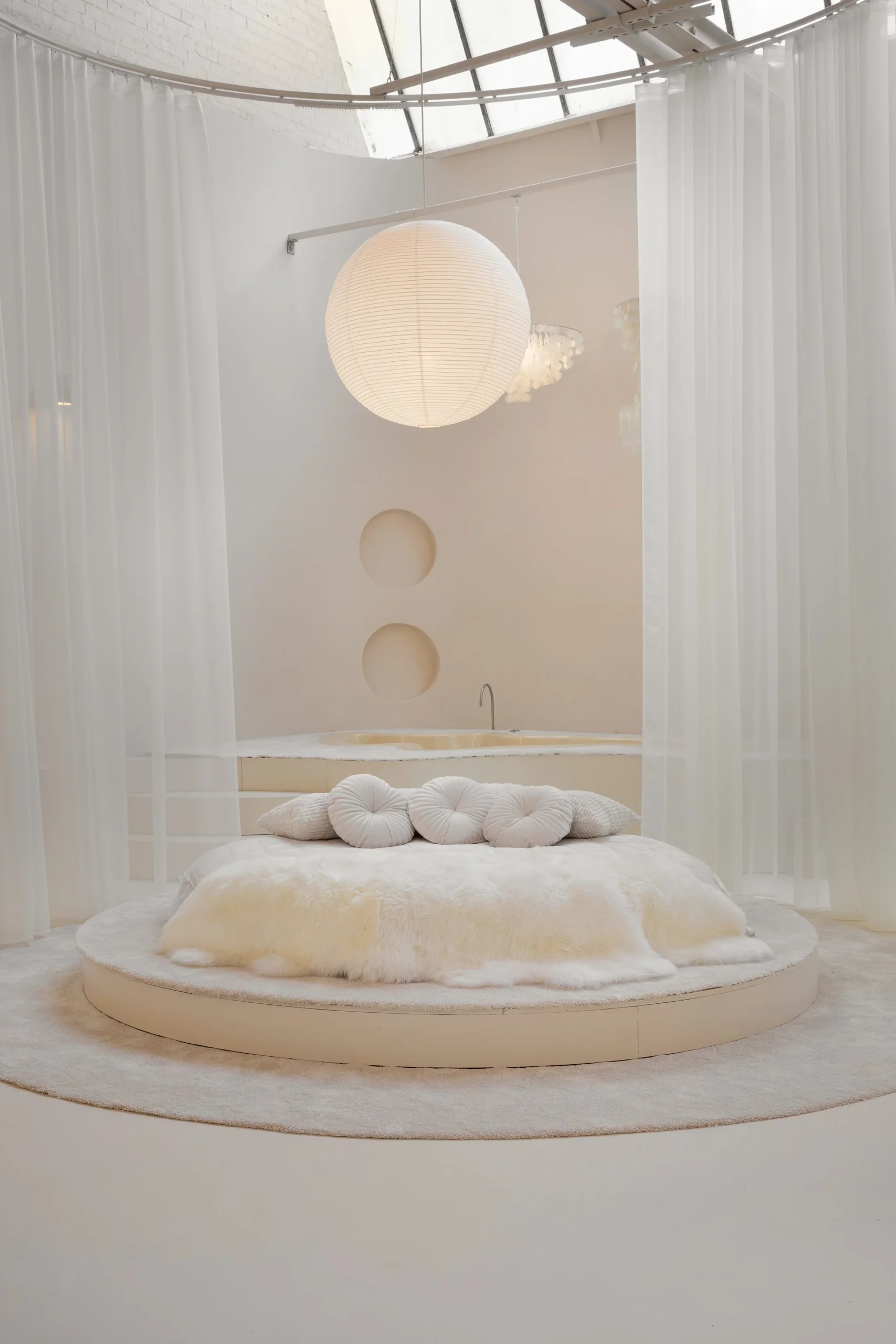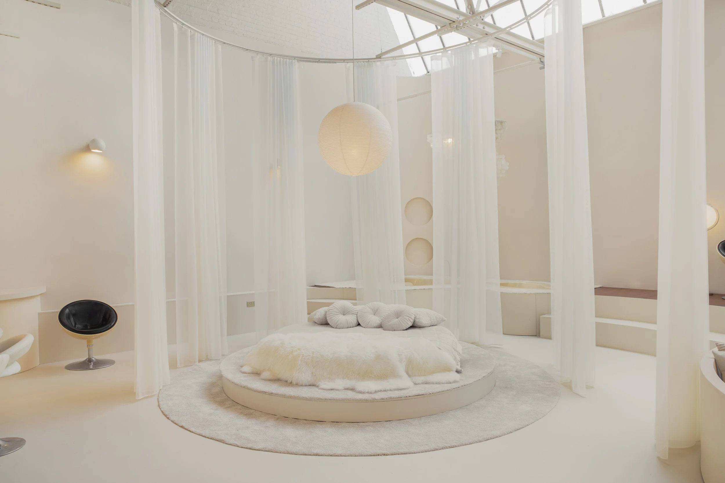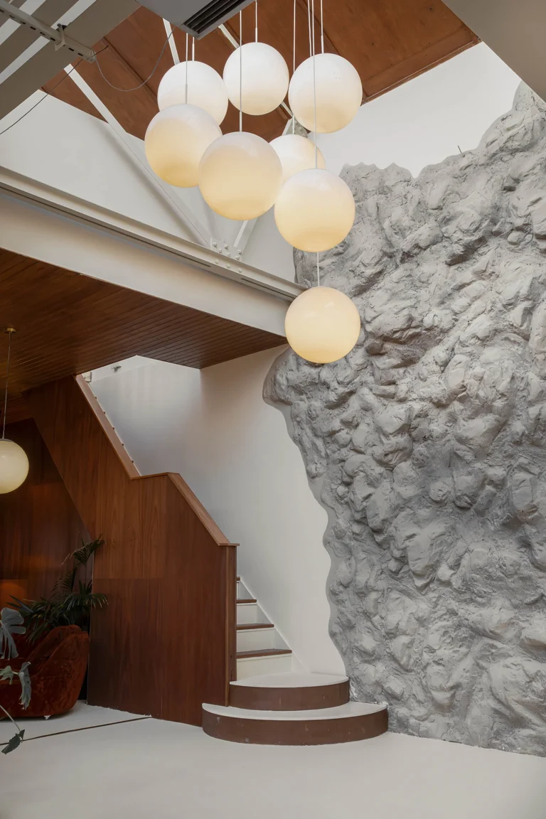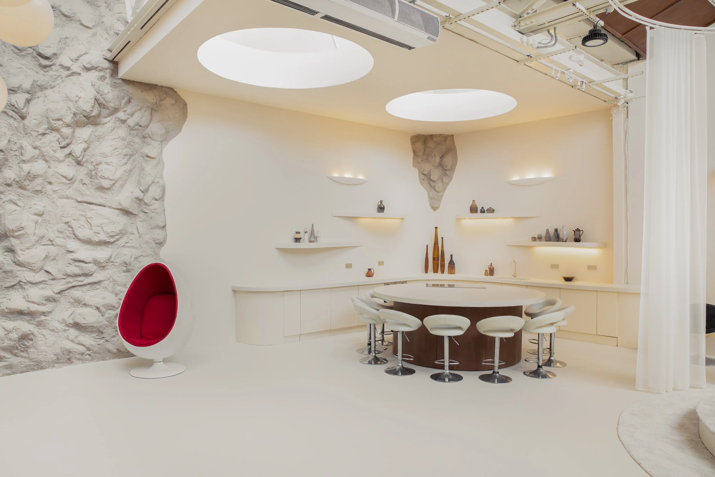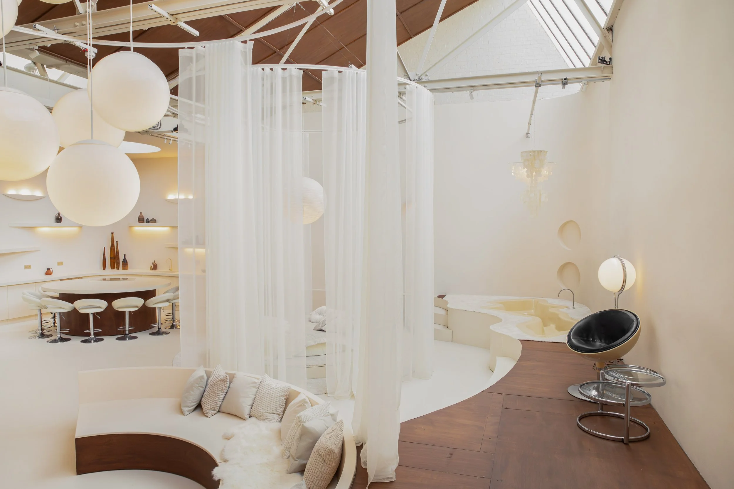 Interior: Open-plan layout / Modular conversation pit / Sunken bath / Motorized rotating platform / Round bed / 10m long kitchen counter top / 2.4m diameter island / Faux rock wall / Floor-to-ceiling wooden paneling / Mid-century-style staircase / Original vintage pieces and props / Circular curtain tracks / Blackout option / 3.5mx3.5m roller shutter / 2.5m tall glass door / 7m ceilings / Exposed beams