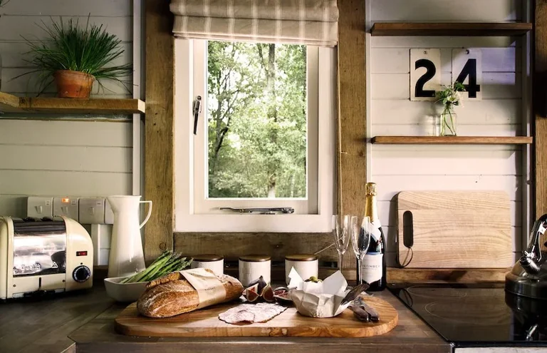 Meticulously crafted from green oak by local artisans, this self-contained abode boasts an open-plan layout, seamlessly integrating a sleeping and living area adorned with a cosy log burner and a compact yet fully equipped kitchen. Ascend to the mezzanine level to unwind in a snug seating area.