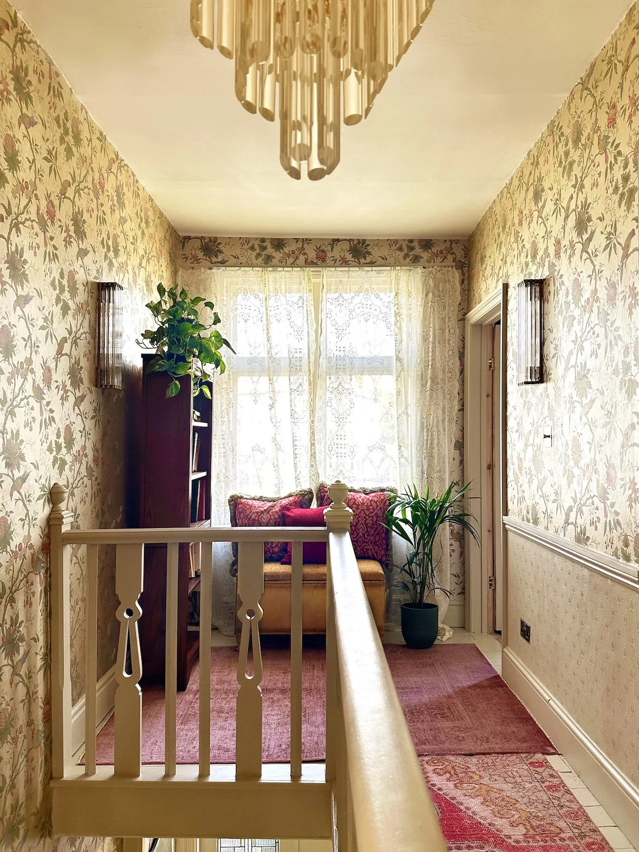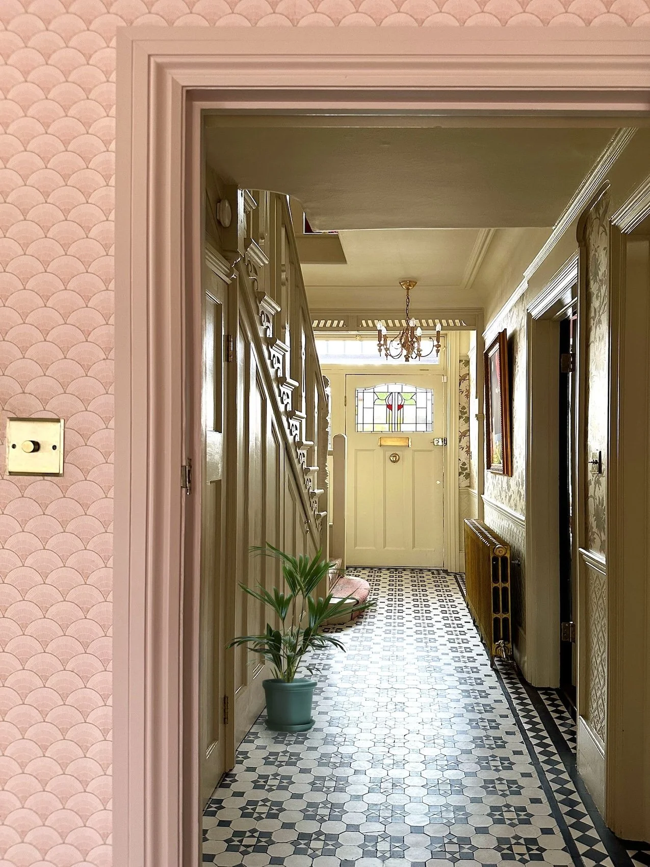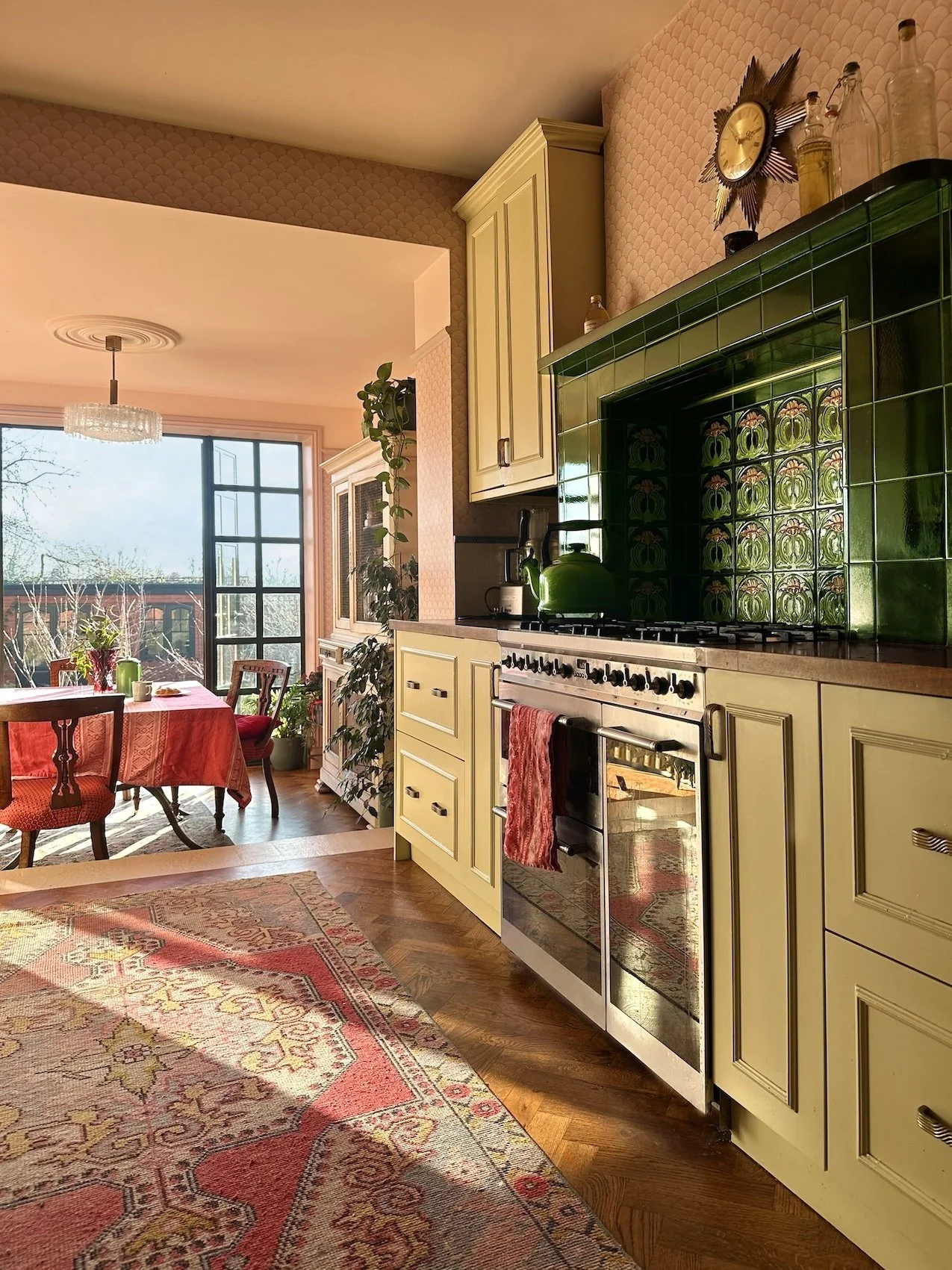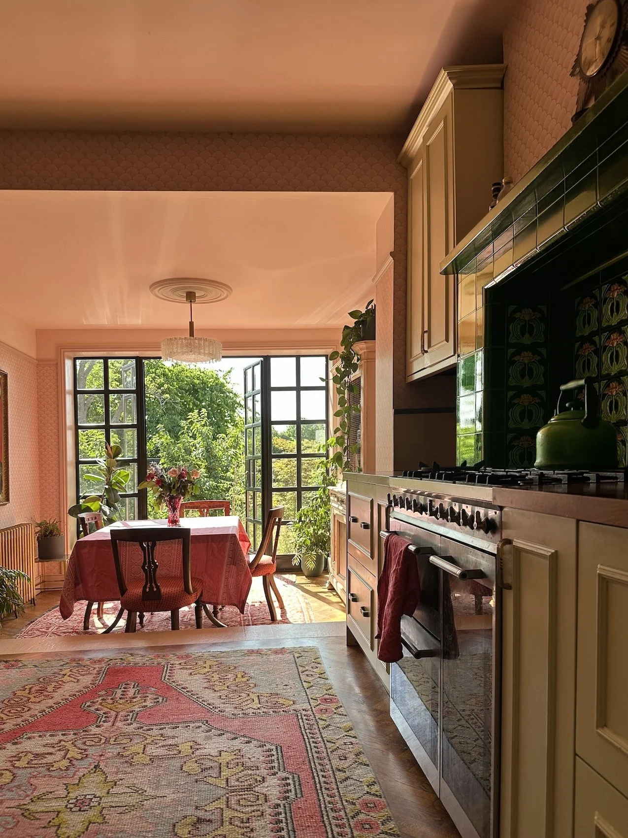 The interior is adorned in a vibrant eclectic style, highlighted by patterned vintage wallpapers, rich color palettes, and crackle glaze tiles, offering a delightful textural experience. The vintage-inspired cream and pink kitchen is enhanced by steel Crittall double doors that open onto a herringbone brick patio, perfect for outdoor entertaining.