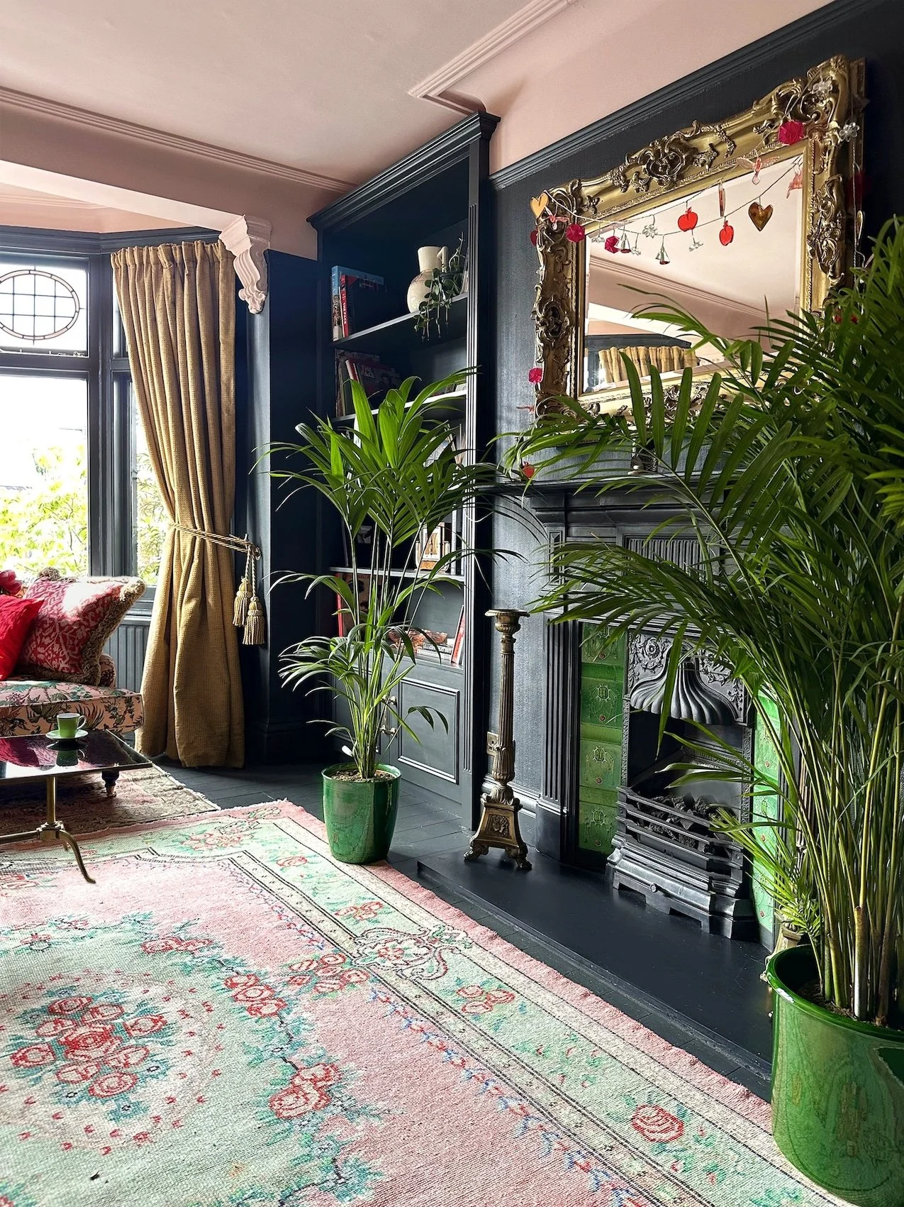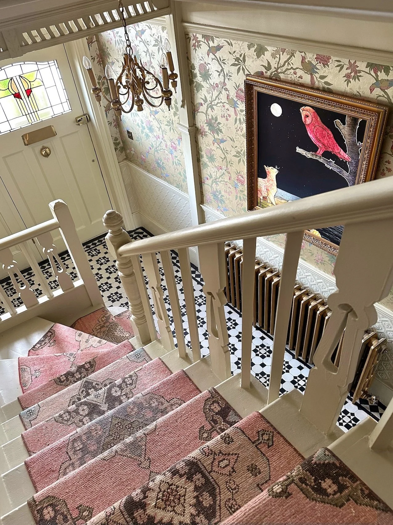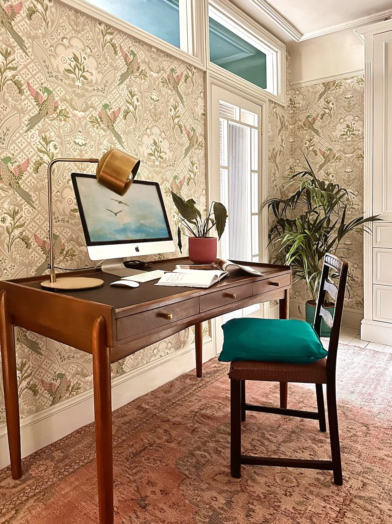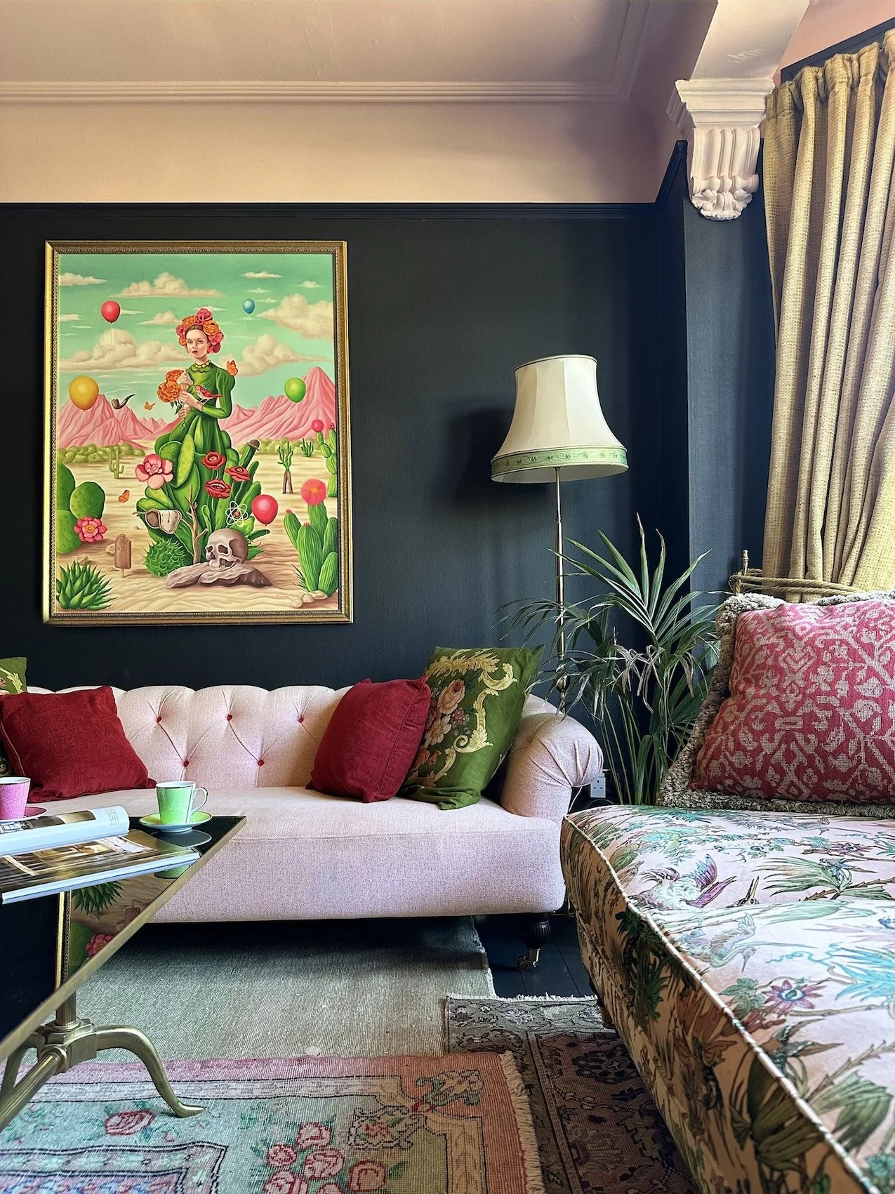 The interior is adorned in a vibrant eclectic style, highlighted by patterned vintage wallpapers, rich color palettes, and crackle glaze tiles, offering a delightful textural experience. The vintage-inspired cream and pink kitchen is enhanced by steel Crittall double doors that open onto a herringbone brick patio, perfect for outdoor entertaining.