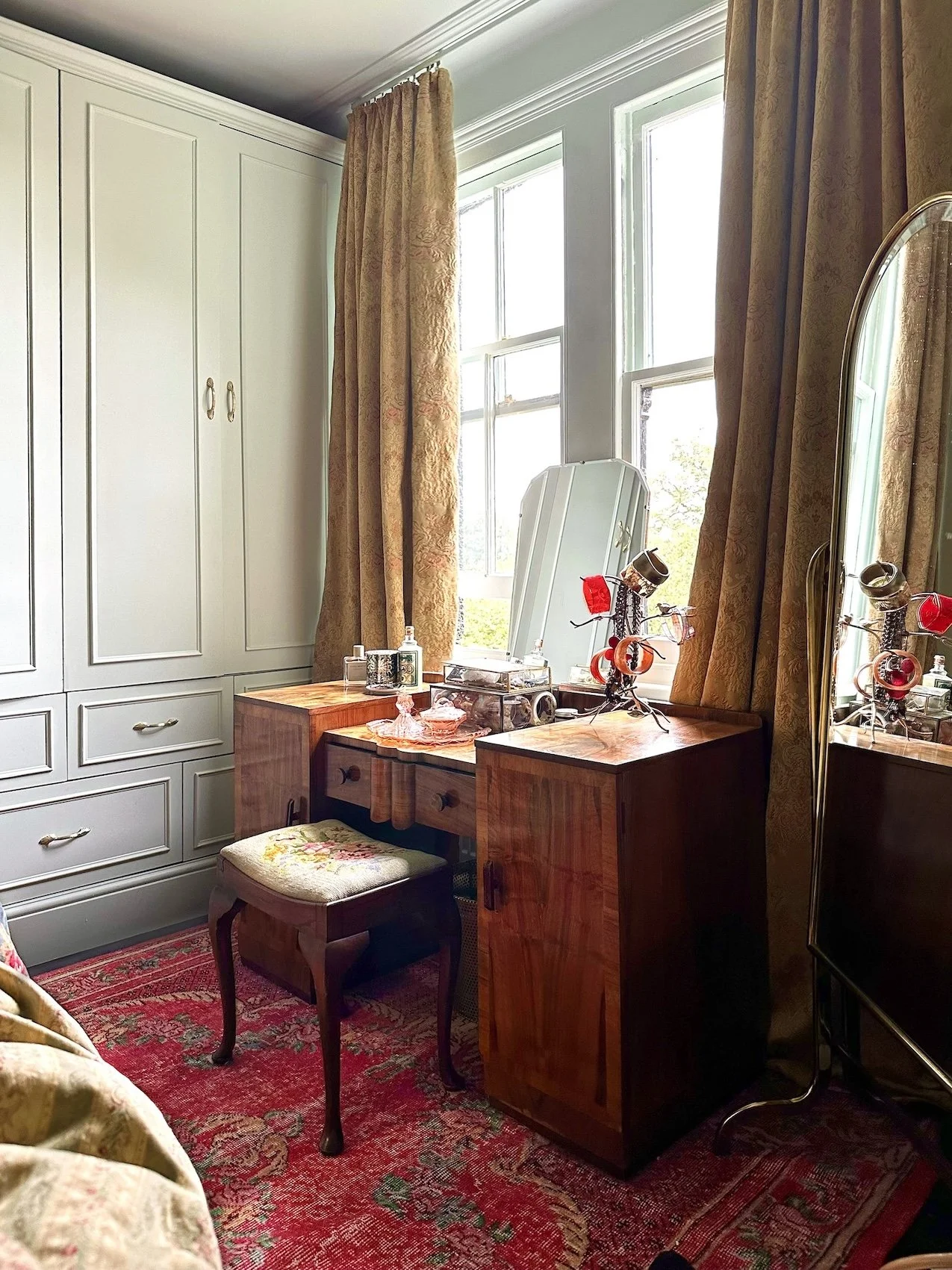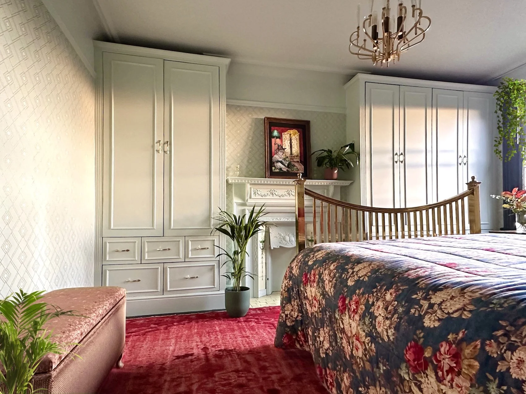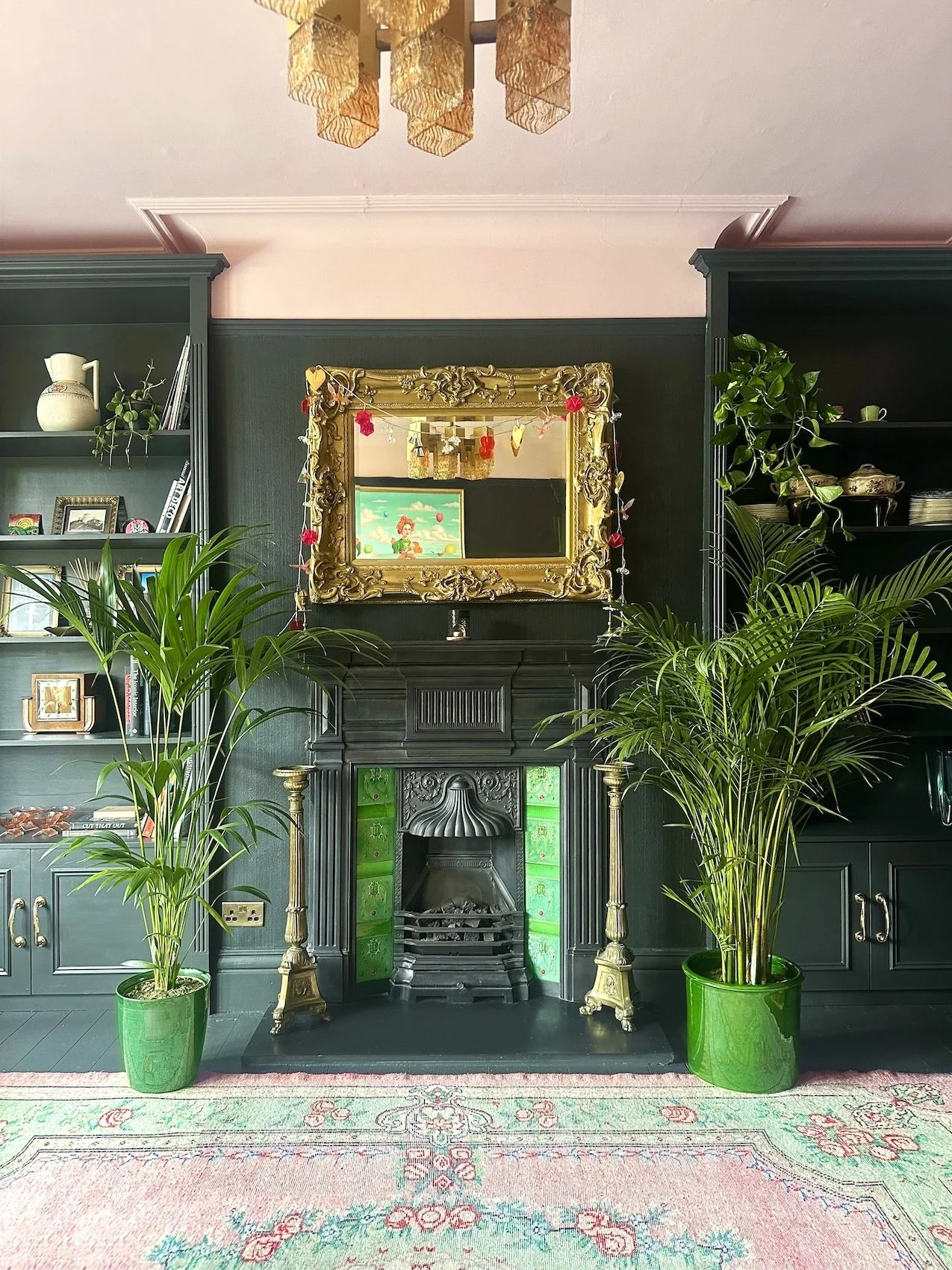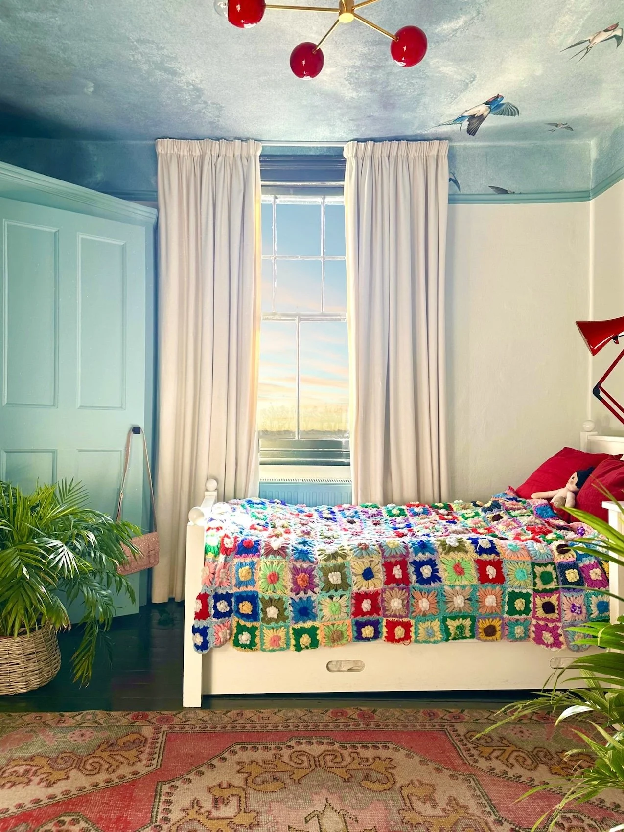 The interior is adorned in a vibrant eclectic style, highlighted by patterned vintage wallpapers, rich color palettes, and crackle glaze tiles, offering a delightful textural experience. The vintage-inspired cream and pink kitchen is enhanced by steel Crittall double doors that open onto a herringbone brick patio, perfect for outdoor entertaining.
