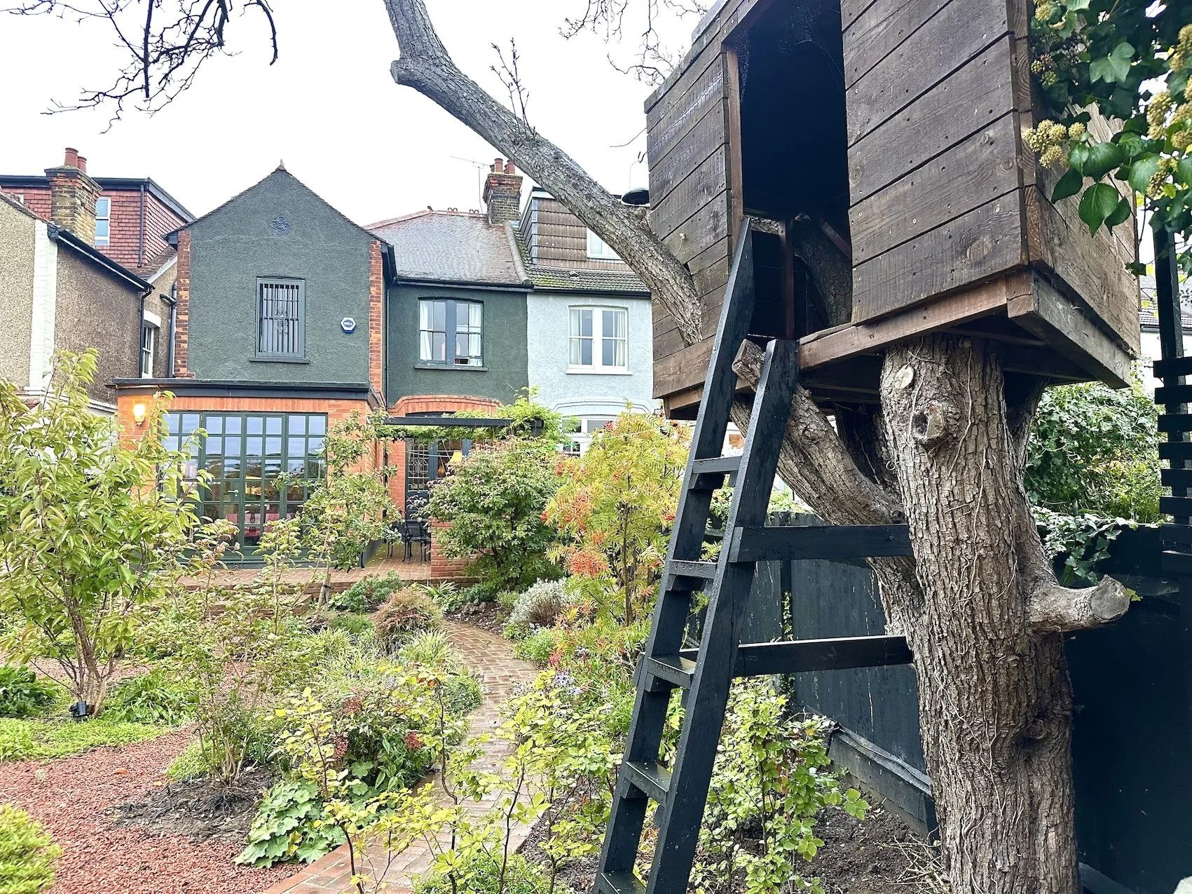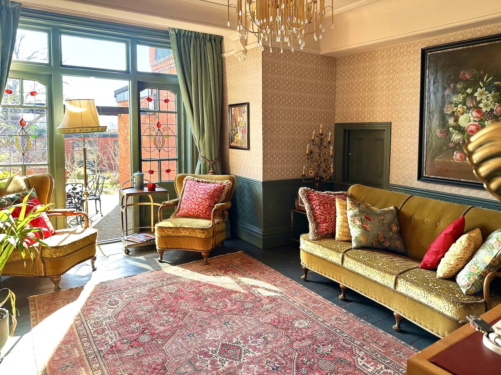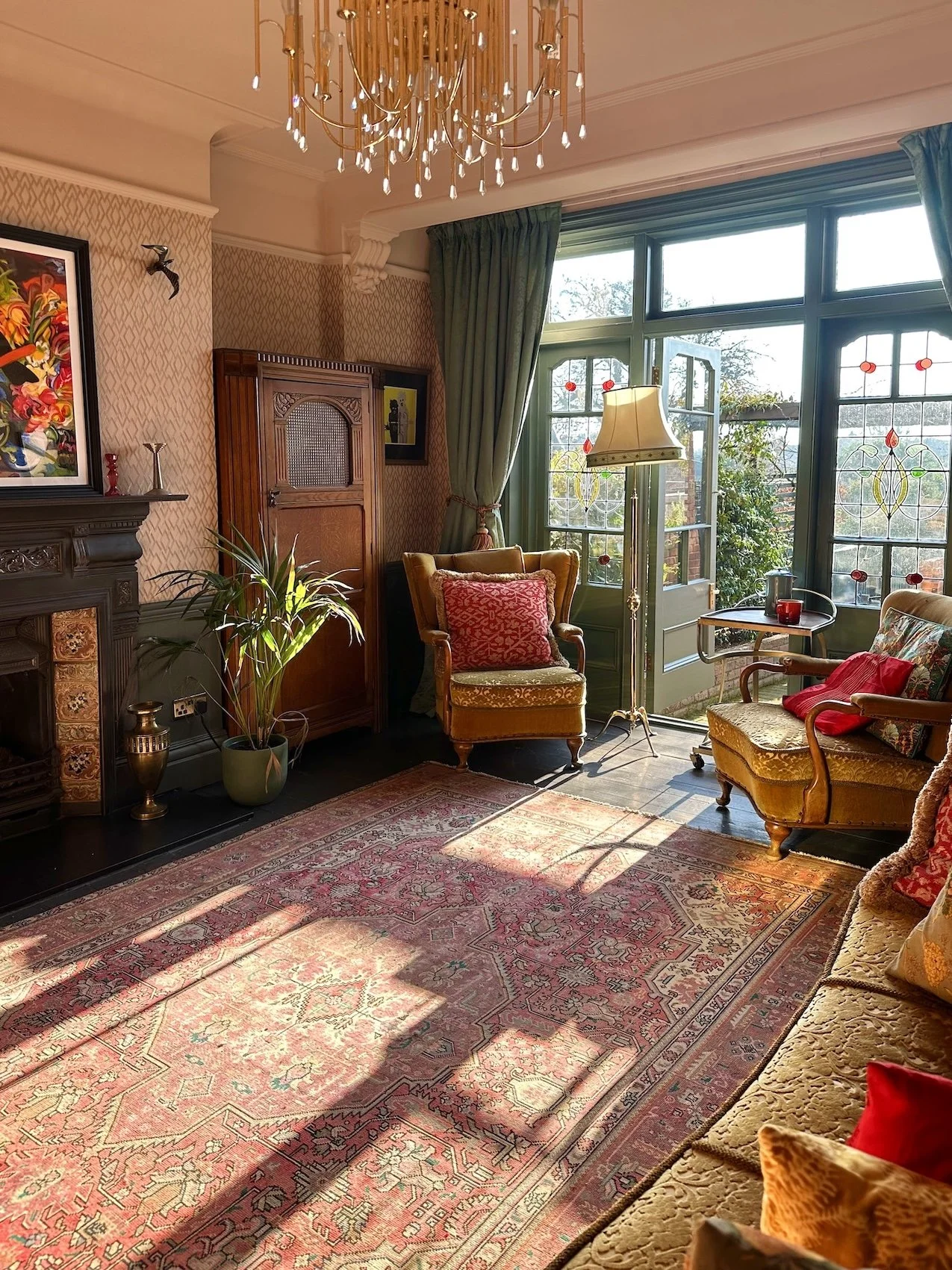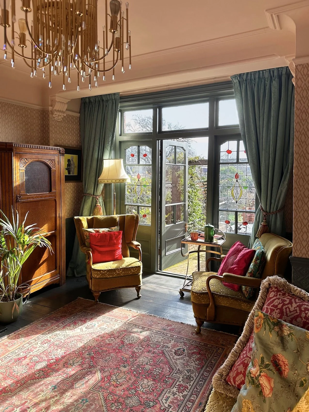 Features: Edwardian / Stained glass windows / Cast iron fireplaces / Mosaic floor / Intricate cornicing / Detailed architraves / Patterned vintage wallpapers / Crackle glaze tiles / Steel Crittall double doors / Herringbone brick patio / Pergola / Classic red roll-top bath / Garden / Two ponds / Garden office / Edwardian timber / Children's treehouse