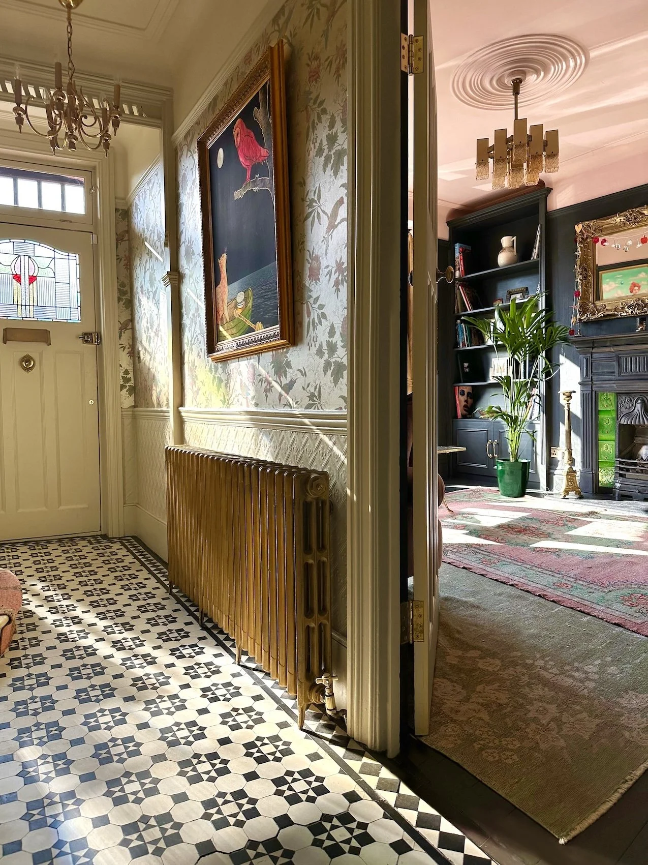 It features original stained glass windows, striking cast iron fireplaces, and a quirky serving hatch that connects the kitchen to the dining room. The home is designed with split levels, creating an intriguing flow between rooms, and showcases an original mosaic hallway floor, intricate cornicing, and detailed architraves.